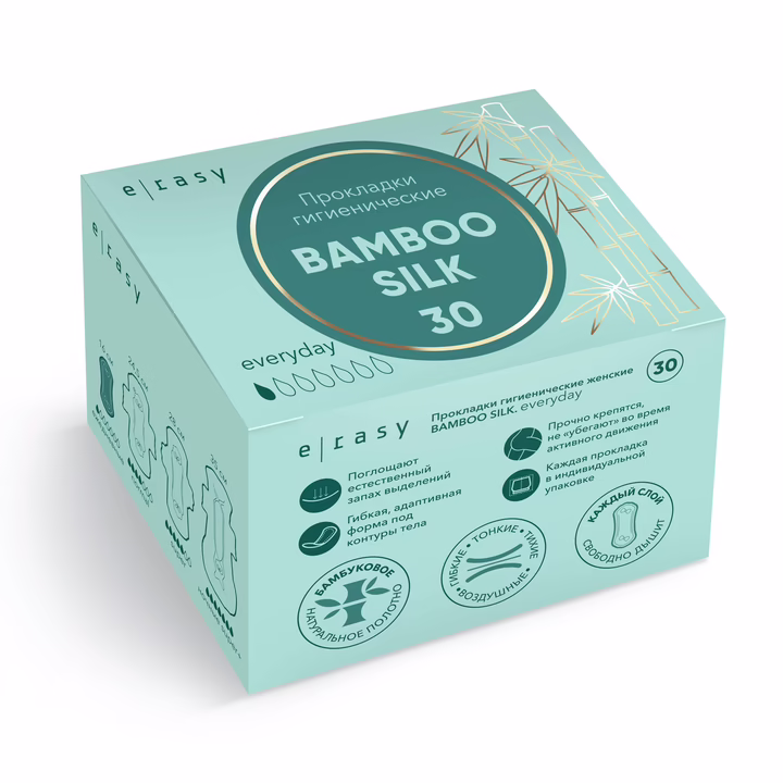 Бамбуковое волокно – природный антибактериальный материал, подходит для людей с чувствительной кожей или ведущих здоровый образ жизни. Тонкие, тихие (не шуршат), гибкие, незаметные для тела прокладки помогают сохранить белье чистым, поглощают запах выделений.