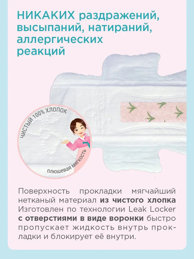 Мягкий слой из 100% хлопка для максимального комфорта и мгновенного впитывания. Функциональный анионовый чип блокирует размножение бактерий. Герметичный 3D-барьер защищает от боковых протеканий. Двойной U-образный слой – 360 градусов защита от протеканий. Целлюлозный распределяющий слой равномерно распределяет и блокирует влагу. Абсорбент Sumitomo SAP – основная влагозащита. Микропористая непромокаемая дышащая основа для циркуляции воздуха. Фиксация из нетоксичного – пищевой клей. Супергерметичная индивидуальная упаковка защищает прокладку.
