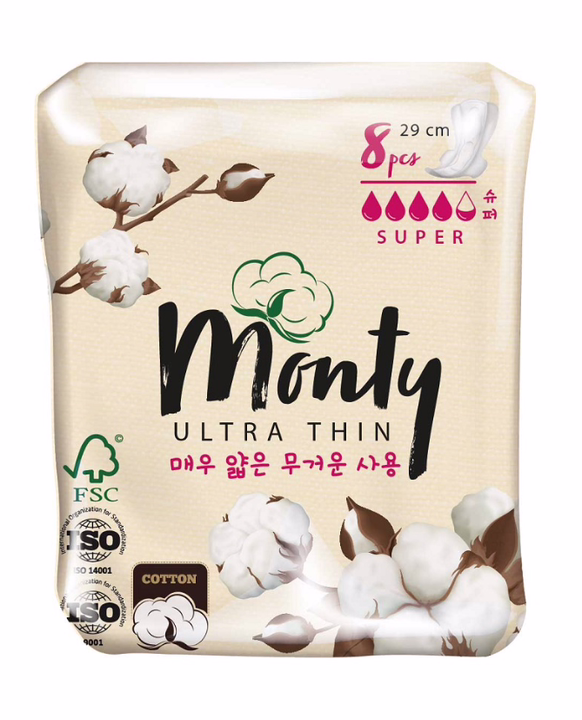 Женские гигиенические прокладки Monty ULTRA THIN SUPER PLUS имеют нежную поверхность из мягкого хлопкового, дышащего материала, мгновенно впитывают влагу и удерживают ее внутри.