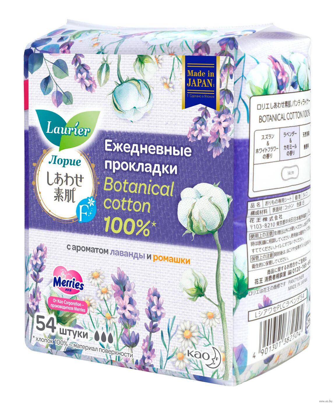 Laurier F Botanical Cotton – гигиенические прокладки для ежедневного использования с ароматом лаванды и ромашки. Поверхность, состоящая из 100% хлопка, обеспечивает ощущение нежности на коже. Способствует снижению неприятных ощущений и возможного риска возникновения раздражений, поэтому прокладки подходят даже для самой чувствительной кожи.