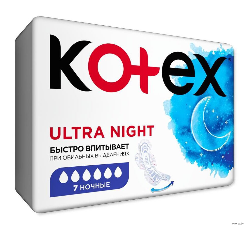 Ночные прокладки Kotex Ultra для обильных выделений во время сна. Улучшенная защита и новый стильный дизайн. Обеспечивают комфорт и уверенность до 100% ночью. Прокладка стала более гибкой, чтобы лучше подстраиваться под анатомию твоего тела и защищать от протеканий. Лучшая защита от Kotex, чтобы чувствовать себя комфортно ночью!