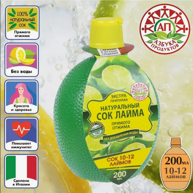 100% натуральный сок лайма. Без воды, сахара и красителей. Используется для приготовления лимонада, коктейлей, в кулинарии – добавляют в домашнюю выпечку, в рыбные и мясные блюда, для приготовления заправок к салатам.
