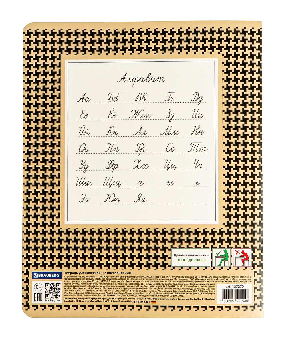 Внутренний блок из офсетной бумаги плотностью 60 г/м2 содержит 12 листов. Белизна – 100%. Линовка – линия с полями.