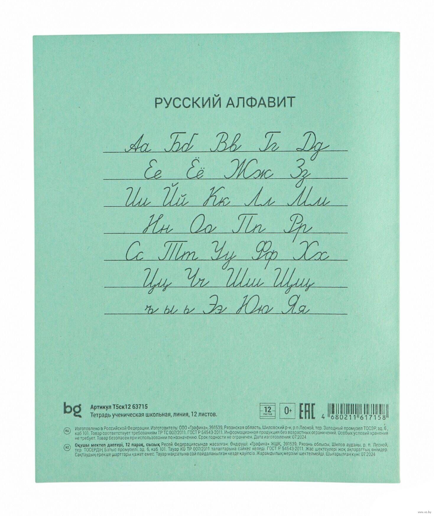 Внутренний блок – офсетная бумага плотностью 60-65 г/м², белизна – 92%, линовка – линия. Обложка тетради изготовлена из бумаги обложечной. Универсальная тетрадь идеально подойдет для школьников любого года обучения. Сзади на обложке размещен русский алфавит.