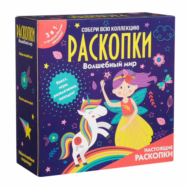 В наборе вы найдете три бруска для раскопок с настоящими волшебными находками, а также настольную игру, книжку с квестом и три открытки для раскрашивания с единорогами и феями.