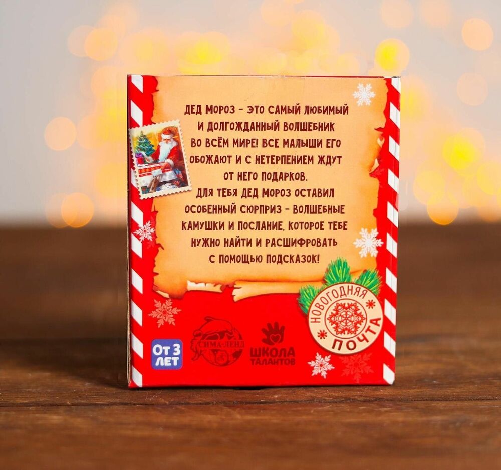 Дедушка Мороз спрятал волшебные камушки и секретное послание, которое предстоит найти и расшифровать с помощью подсказок.