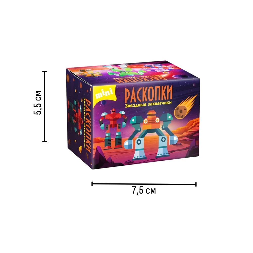 Брусок в этом мини-наборе для раскопок хранит в себе тайны космических сражений. Внутри коробочки вы также найдёте прочный инструмент с удобным наконечником и инструкцию – ребёнку будет легко отыскать разноцветных космических захватчиков. С фигурками можно играть, также их можно использовать как брелок – в каждой есть отверстие для нитки.