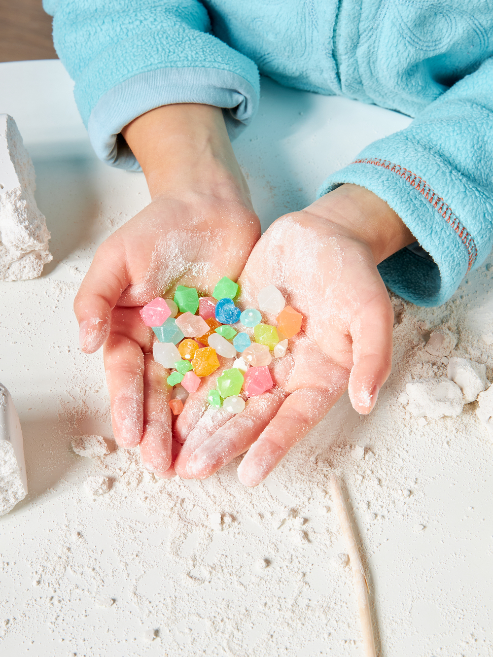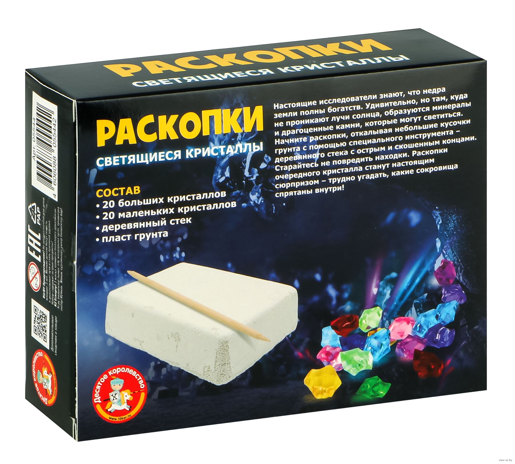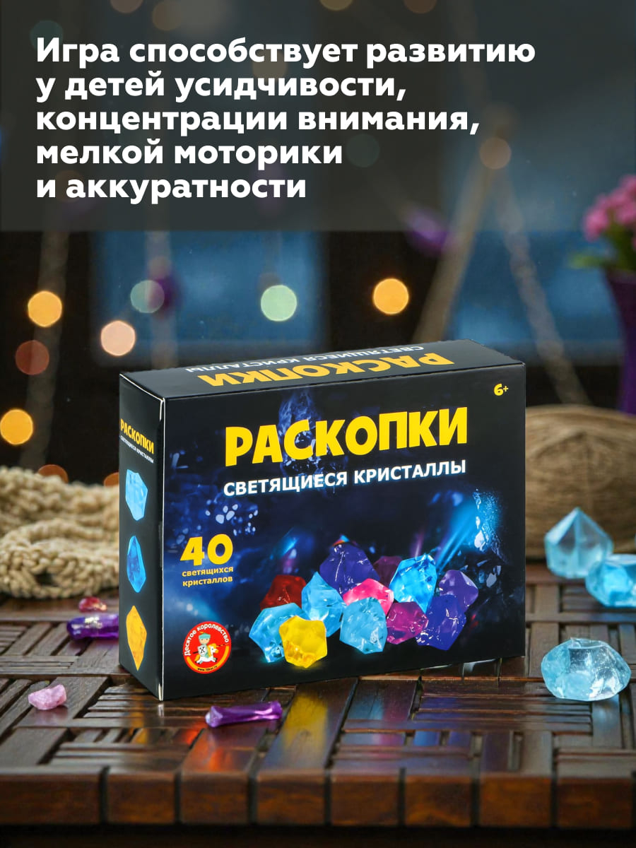 Игра раскопки для детей "Светящиеся кристаллы" развивает концентрацию, мелкую моторику и точность движений. Добытые артефакты можно использовать для других игр или для украшения интерьера.