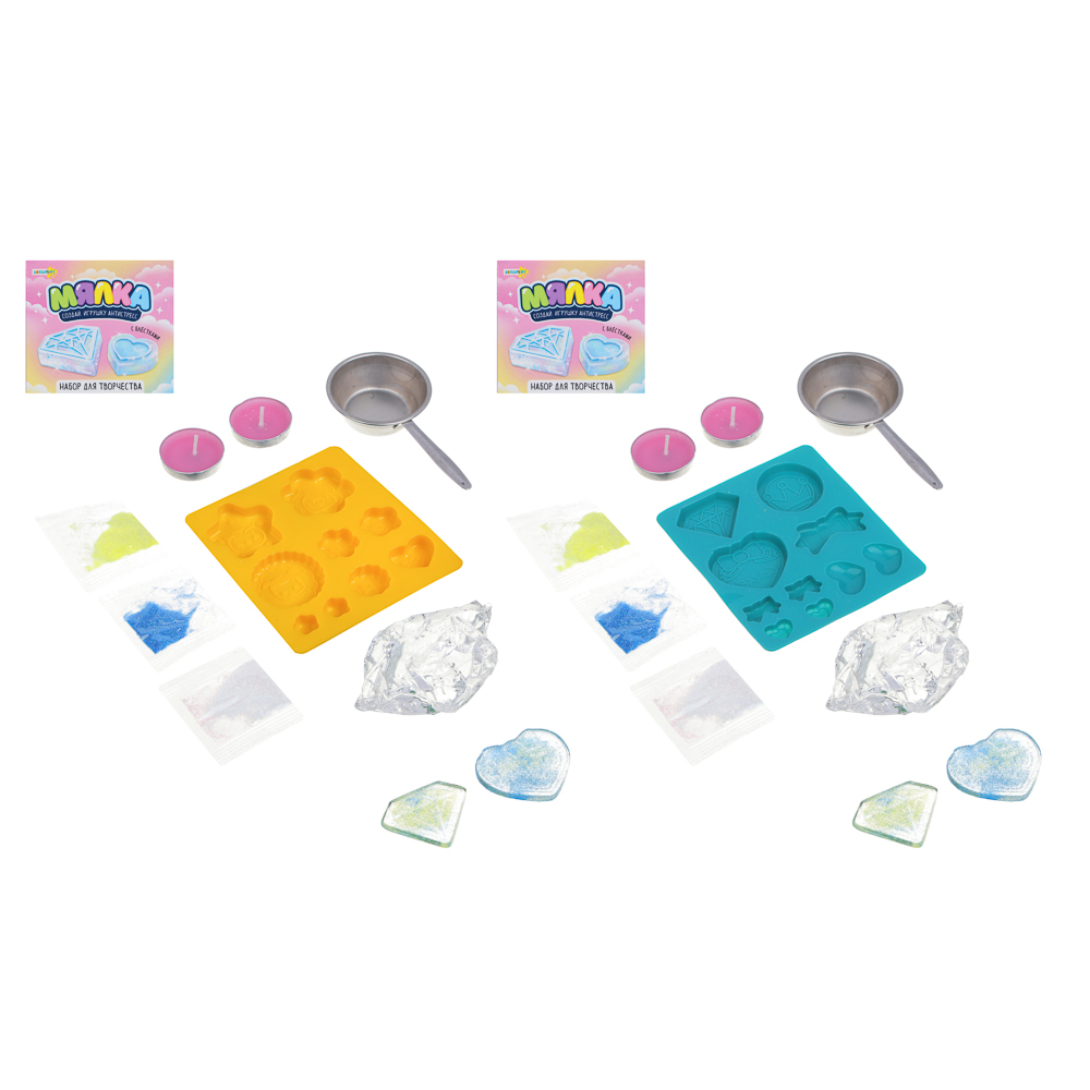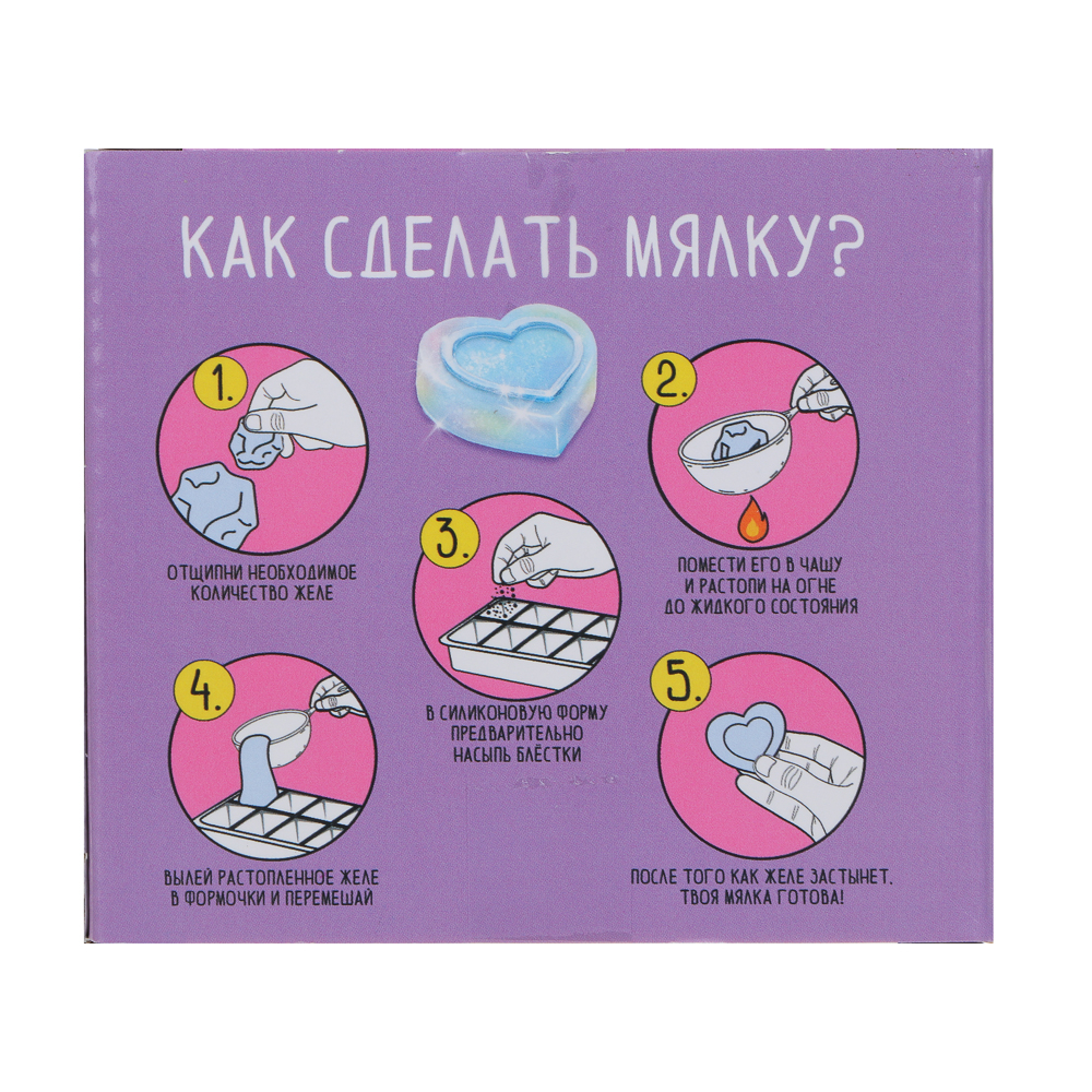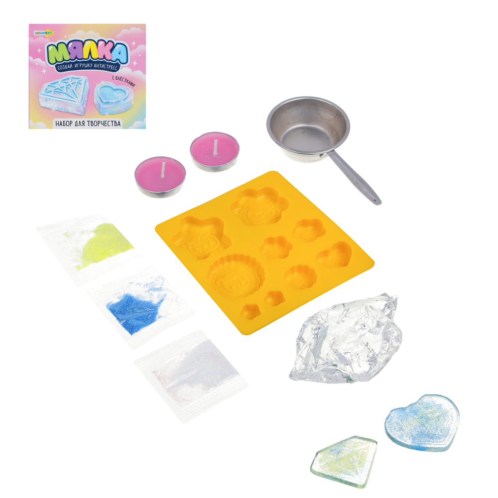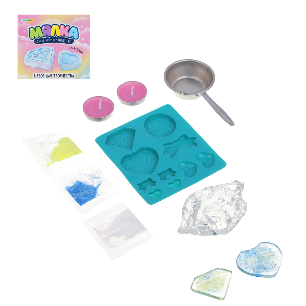 Набор для творчества "Мялка" – это полный комплект для изготовления игрушки-антистресс с блестками своими руками. Включает специальное желе для растапливания, силиконовую форму, блестки, парафиновые свечи для разогрева, а также металлический черпак с ручкой.