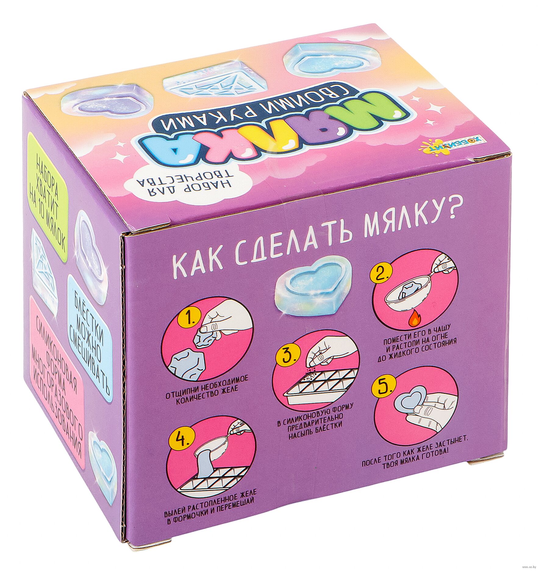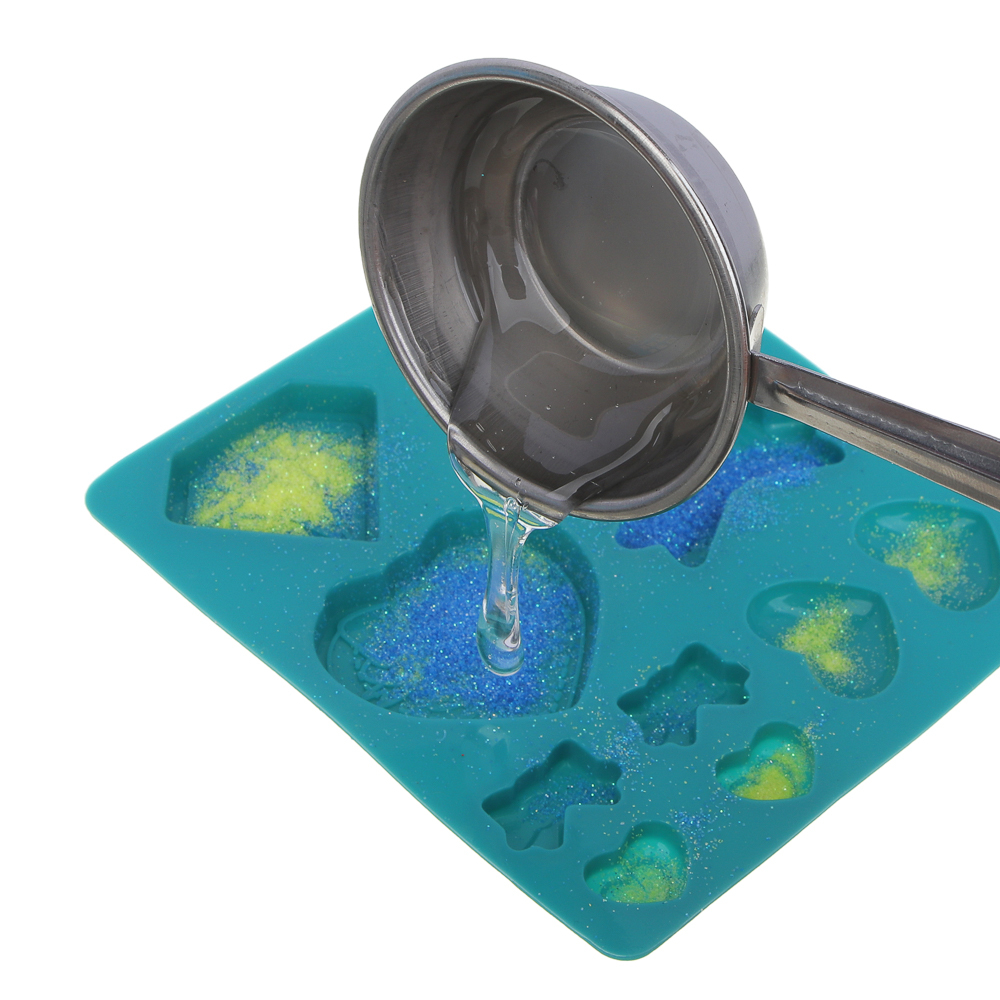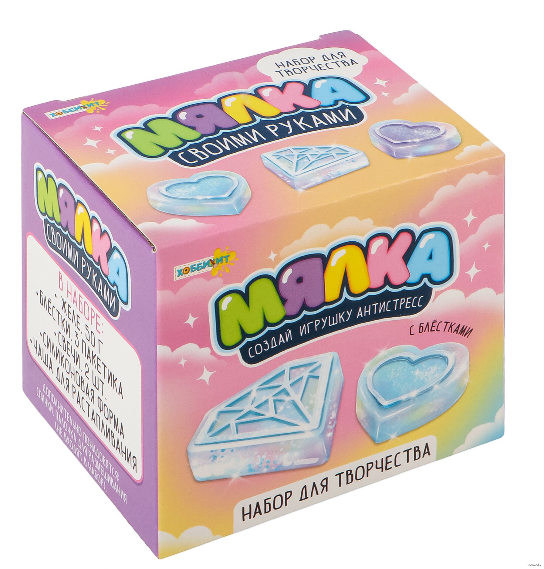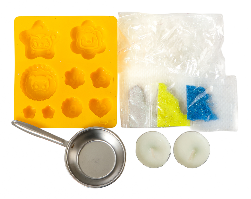 Набор для творчества "Мялка" – это полный комплект для изготовления игрушки-антистресс с блестками своими руками. Включает специальное желе для растапливания, силиконовую форму, блестки, парафиновые свечи для разогрева, а также металлический черпак с ручкой.