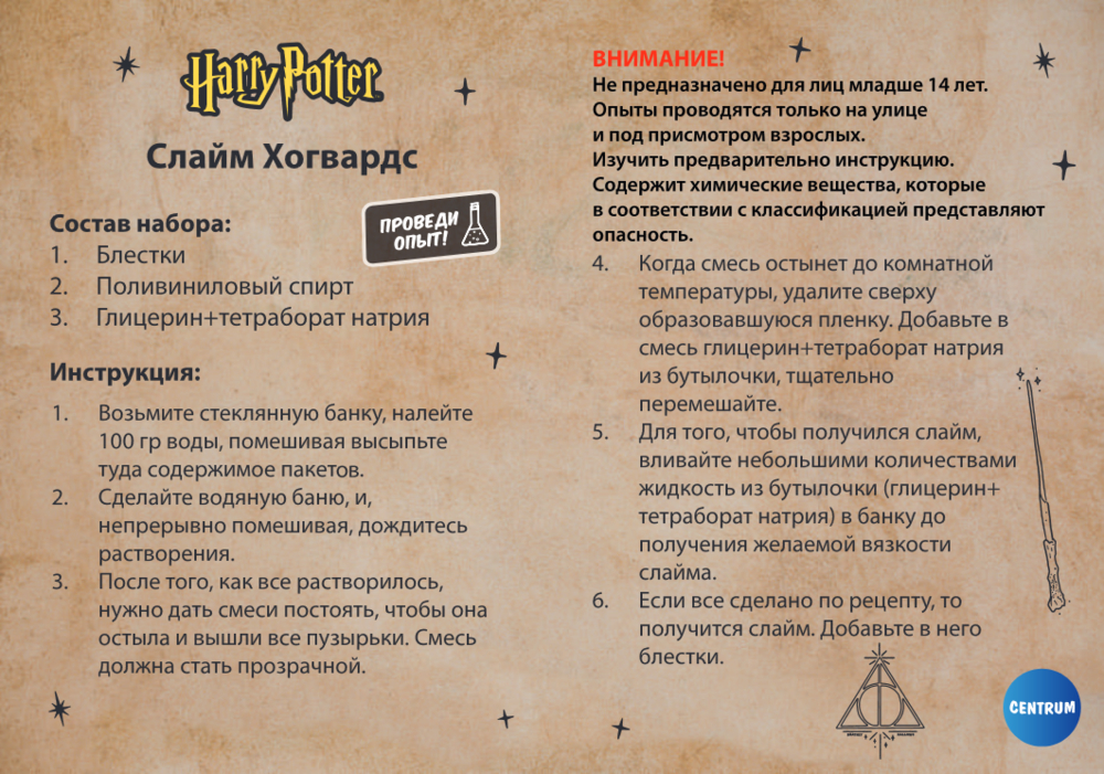 Набор для проведения опытов "Гарри Поттер" – это идеальный способ для детей погрузиться в мир волшебства и науки! Каждый маленький волшебник сможет стать настоящим исследователем, проводя увлекательные эксперименты, которые не только развлекут, но и помогут лучше понять окружающий мир.
