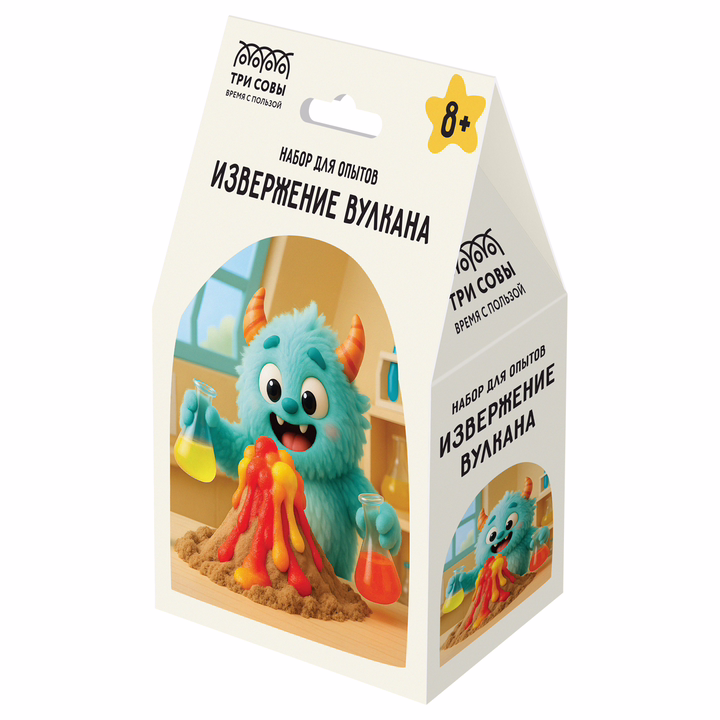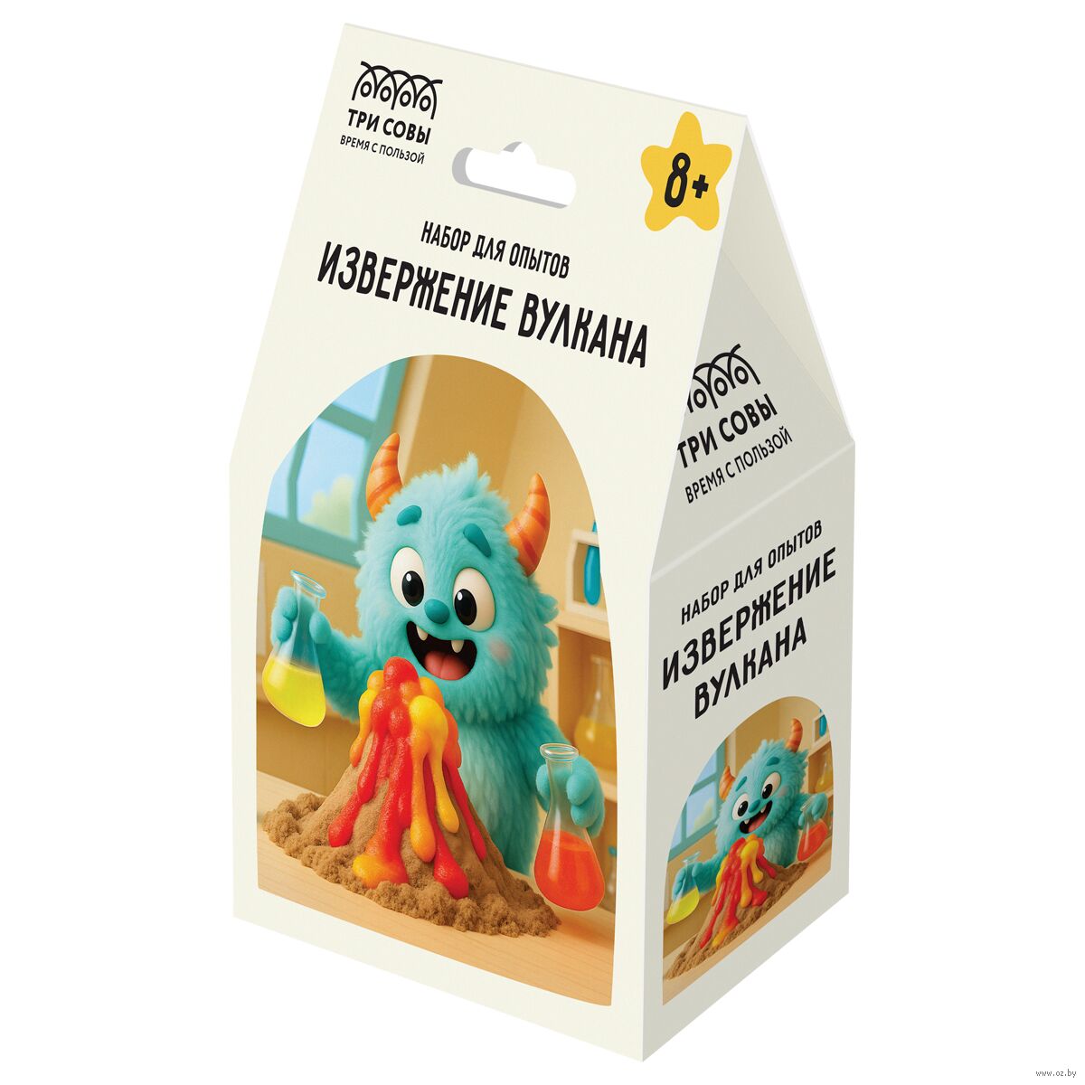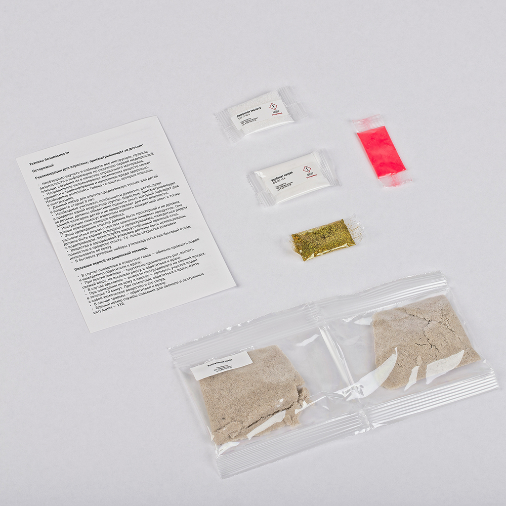 Подготовка опыта "Извержение вулкана" не займет много времени и не потребует усилий. В набор входят: песок, пластификатор, кристаллические соли, лимонная кислота, пищевой краситель, полимерные материалы. В процессе опыта ребёнок слепит из кинетического песка собственный вулкан и устроит яркое, красочное извержение лавы с помощью реагентов.