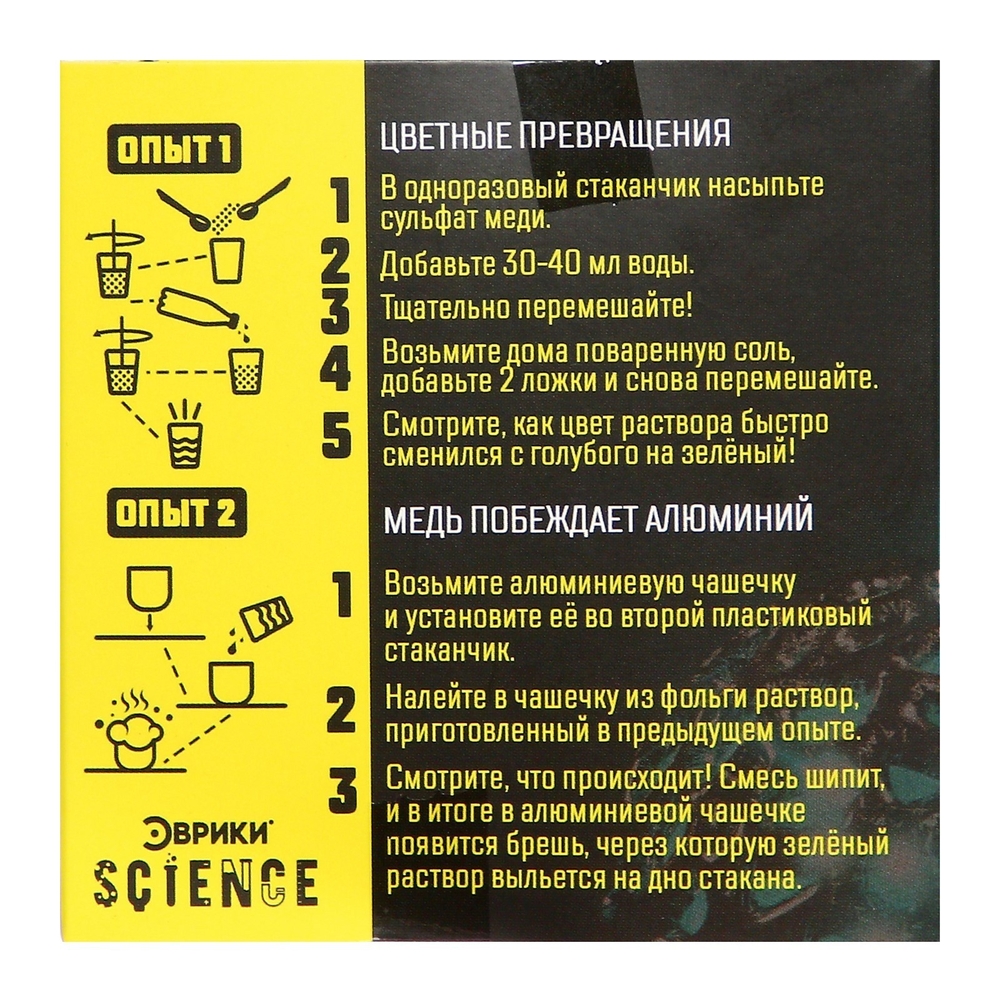 С набором для опытов "Эврики" ребёнок узнает об удивительных свойствах веществ, проведёт два увлекательных эксперимента и удивит друзей.