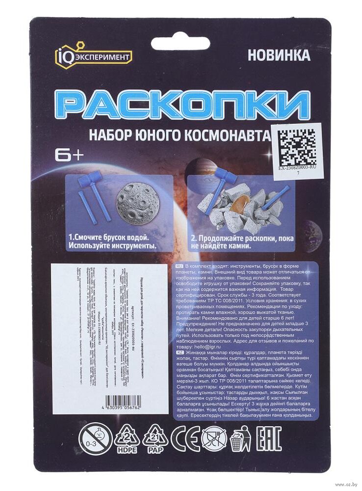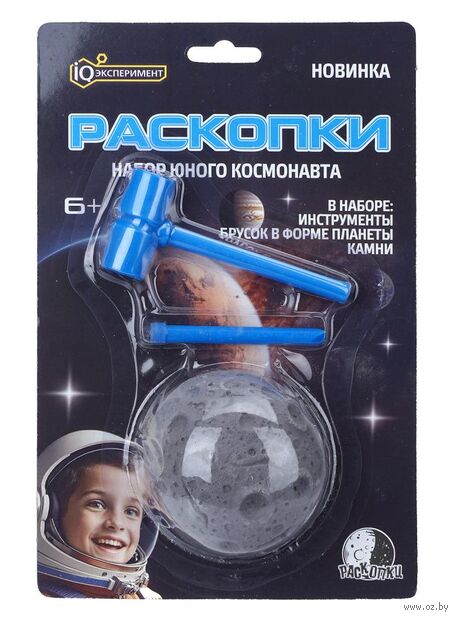 Юному космонавту предстоит принять участие в настоящих космических раскопках: он будет самостоятельно откалывать гипс в виде планеты, извлекать и очищать красивые камешки, используя специальные инструменты. А после раскопок ребёнок сможет использовать очищенные предметы в своих играх.