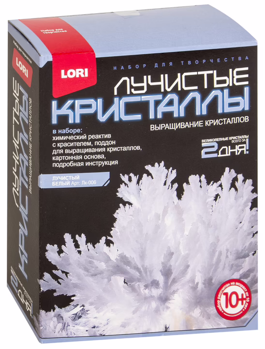 С помощью набора Lori "Лучистые кристаллы" легко и просто проводится химический опыт в домашних условиях по получению настоящих кристаллов. В наборе есть все необходимое, чтобы создать питательную среду, необходимую для появления минералов. Детям очень понравится наблюдать за их ростом, замечать все новые и новые изменения в их причудливой форме. Кристалл вырастает всего за 2 дня, поэтому ребенок с живым увлечением будет вовлечен в собственный научный эксперимент.