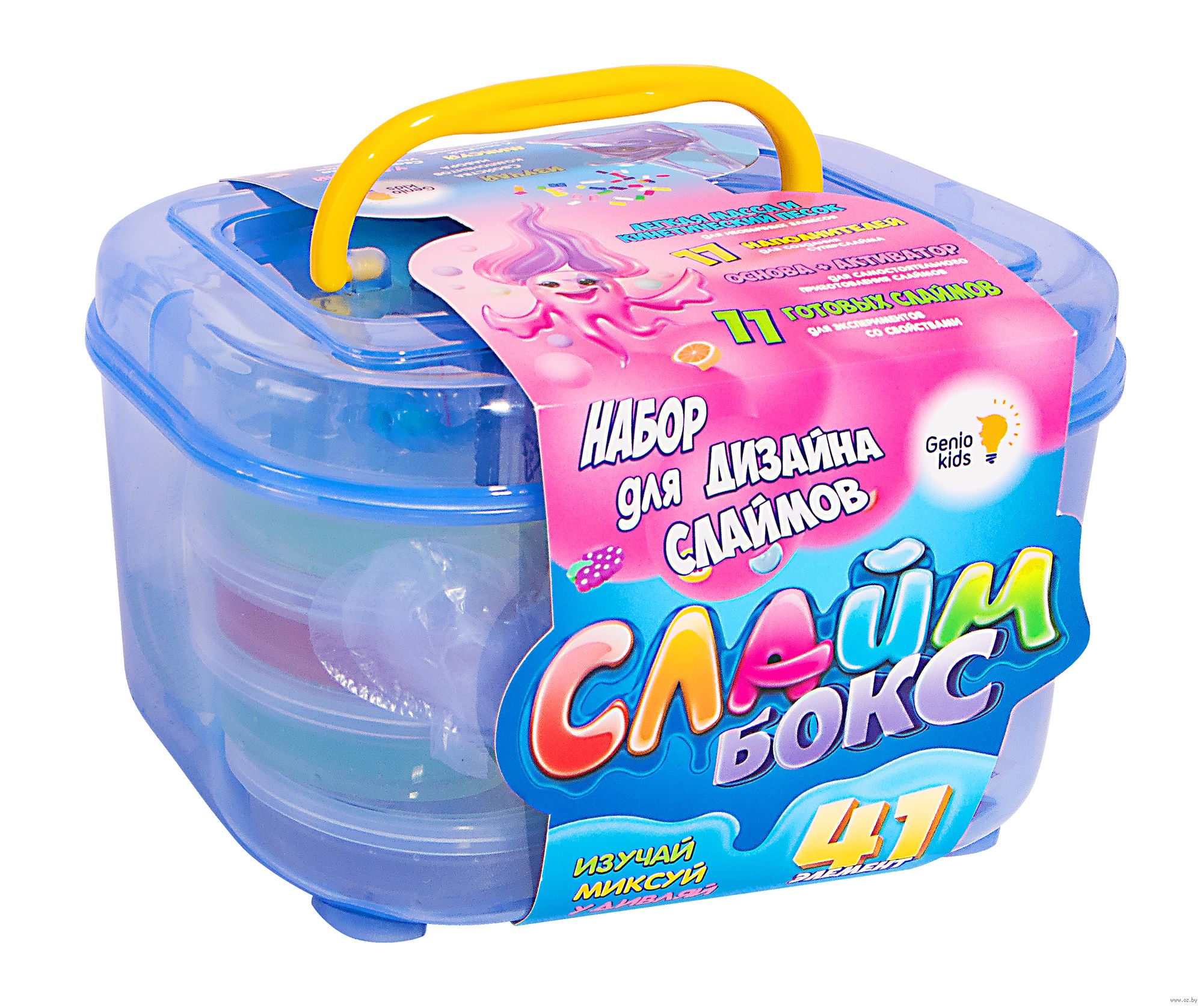Набор для опытов "Создай слайм" - большой набор для создания слаймов, состоящий из готовых основ (Clear Slime, Original Slime, песок, легкий пластилин), ингредиентов для самостоятельного создания слаймов, огромного количества наполнителей (блестки, красители, ароматизатор, различные посыпки) и вспомогательных инструментов. Это гигантское пространство для реализации всех пожеланий юного экспериментатора. Изучай, миксуй, удивляй!