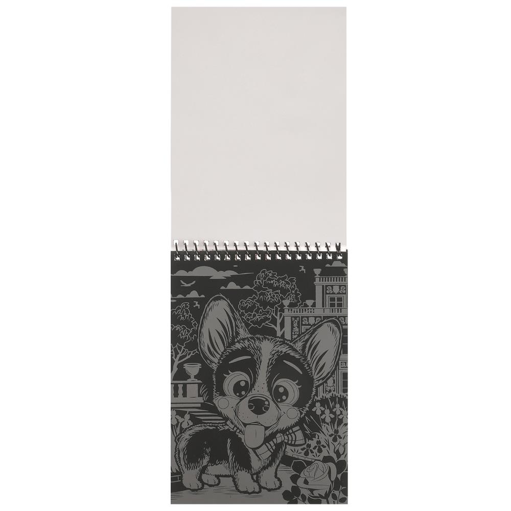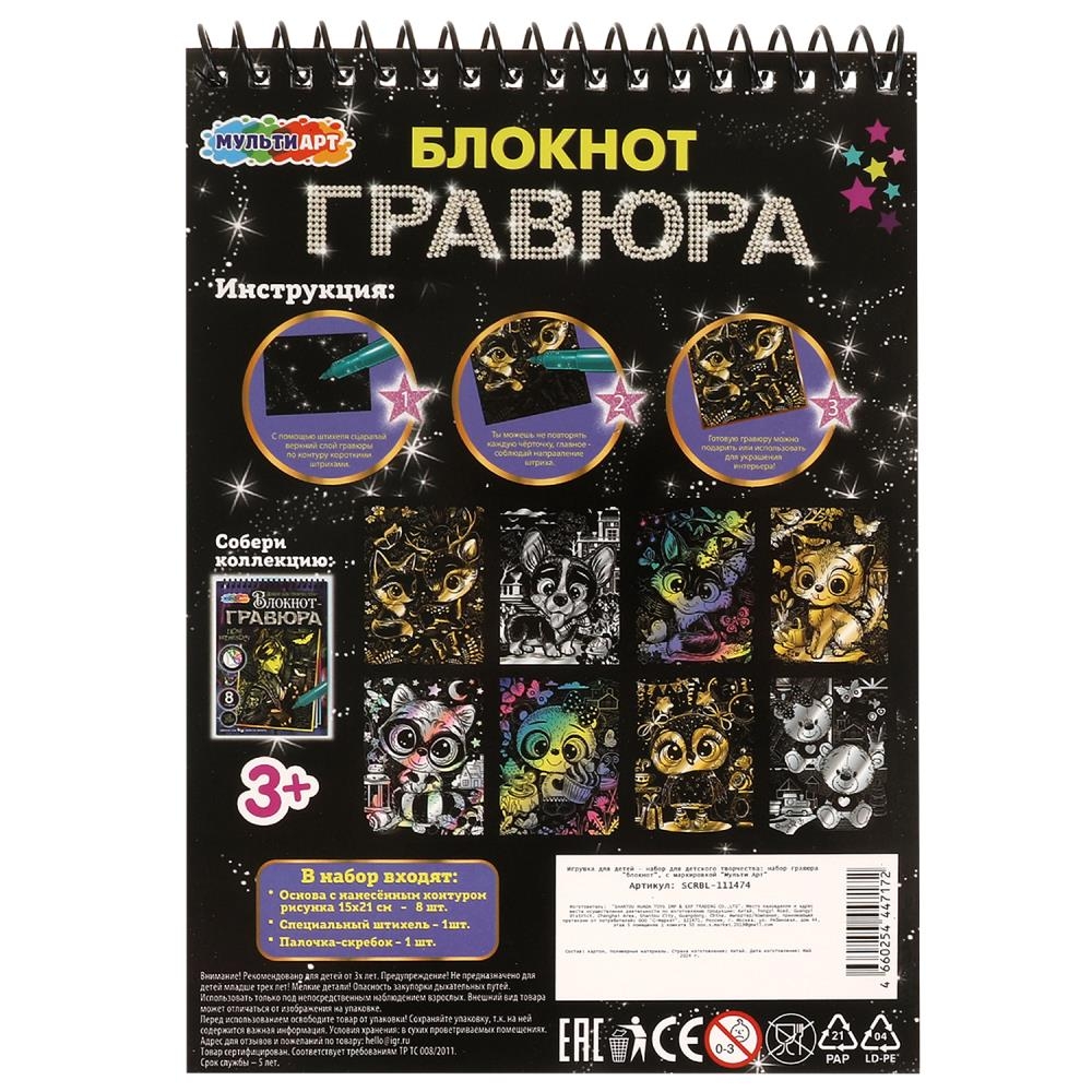 С помощью данного набора юный художник сможет создать 8 эффектных картин на чёрном фоне. Контур рисунка уже нанесён на основу, остаётся только процарапать изображение специальным штихелем. Можно не повторять каждую черточку, главное – соблюдать направление штриха! Готовая поделка станет отличным вариантом для подарка близким или для украшения интерьера комнаты.