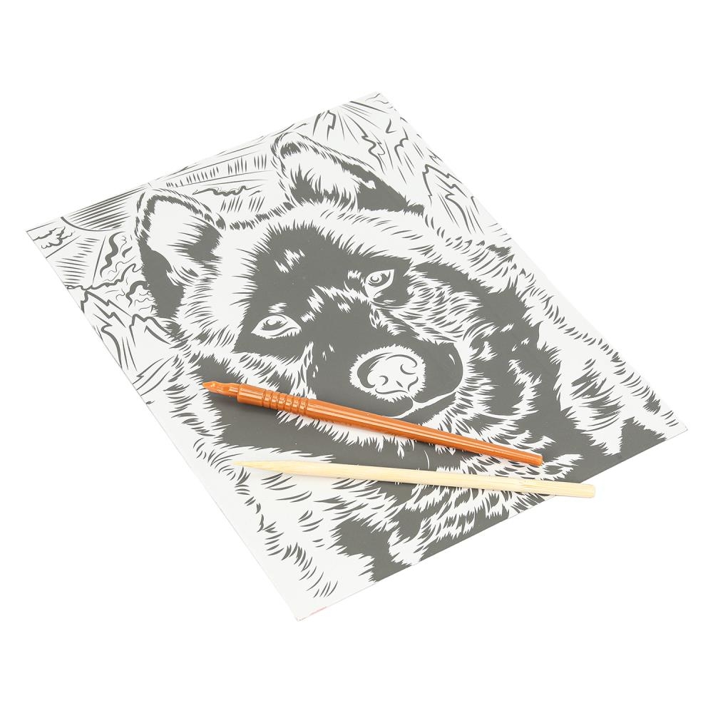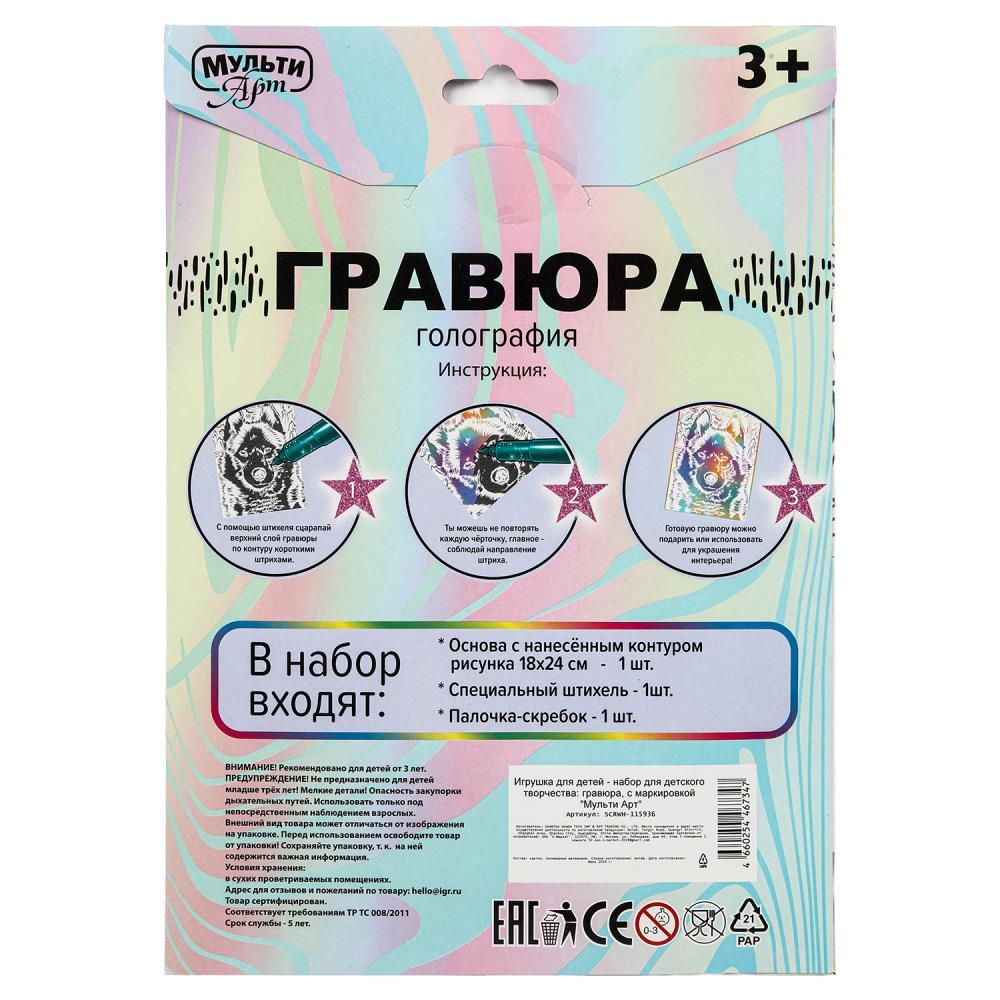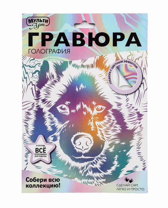 С помощью данного набора юный художник сможет создать эффектную блестящую картину на белом фоне. Контур рисунка уже нанесён на основу, остаётся только процарапать изображение специальным штихелем. Можно не повторять каждую черточку, главное – соблюдать направление штриха!Готовая поделка станет отличным вариантом для подарка близким или для украшения интерьера комнаты.