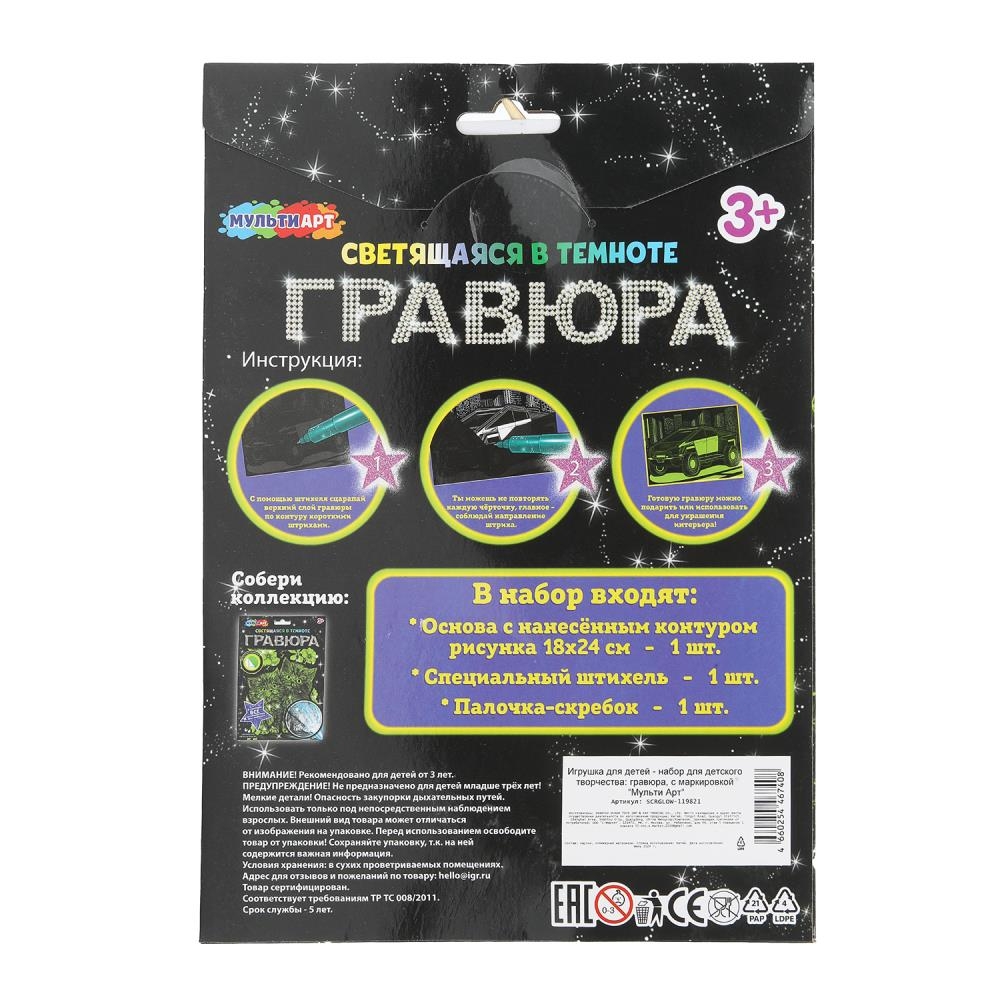 С помощью данного набора юный художник сможет создать эффектную картину на чёрном фоне, которая загадочно светится в темноте.Контур рисунка уже нанесён на основу, остаётся только процарапать изображение специальным штихелем. Можно не повторять каждую черточку, главное – соблюдать направление штриха!