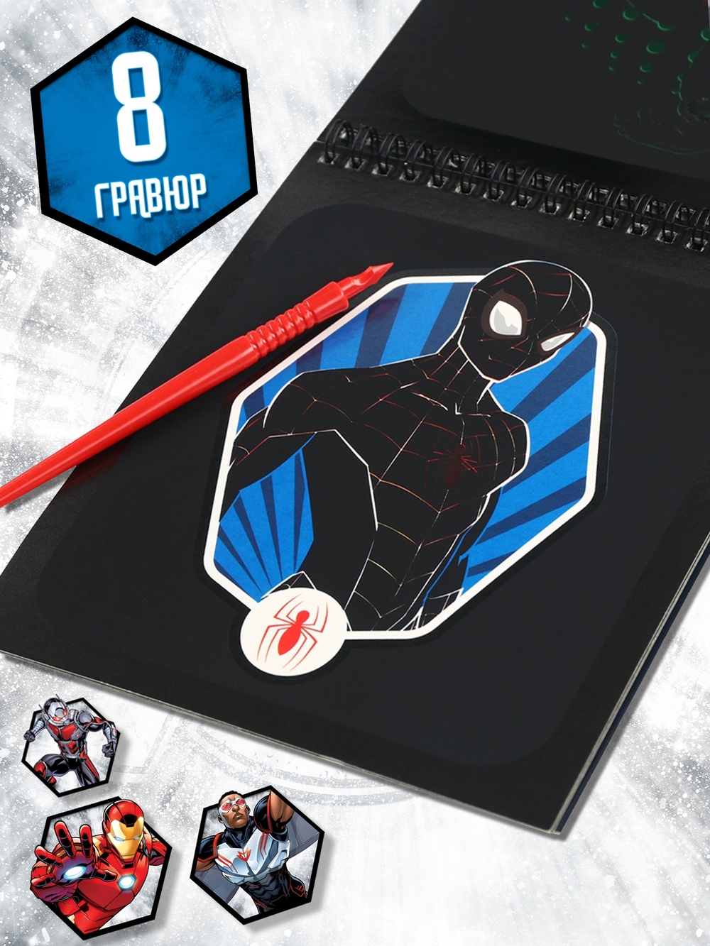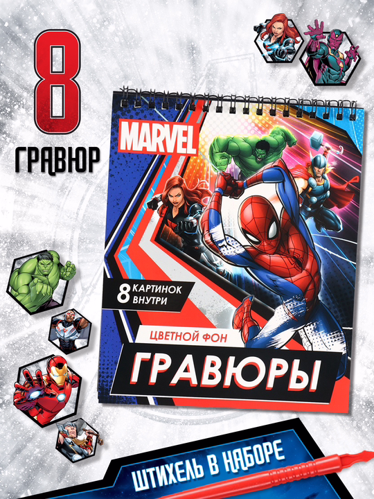 Творческий процесс с гравюрами развивает мелкую моторику, аккуратность и воображение. Разноцветное основание добавляет яркости готовым работам, а наличие героев из «Мстителей» делает занятия особенно захватывающими.