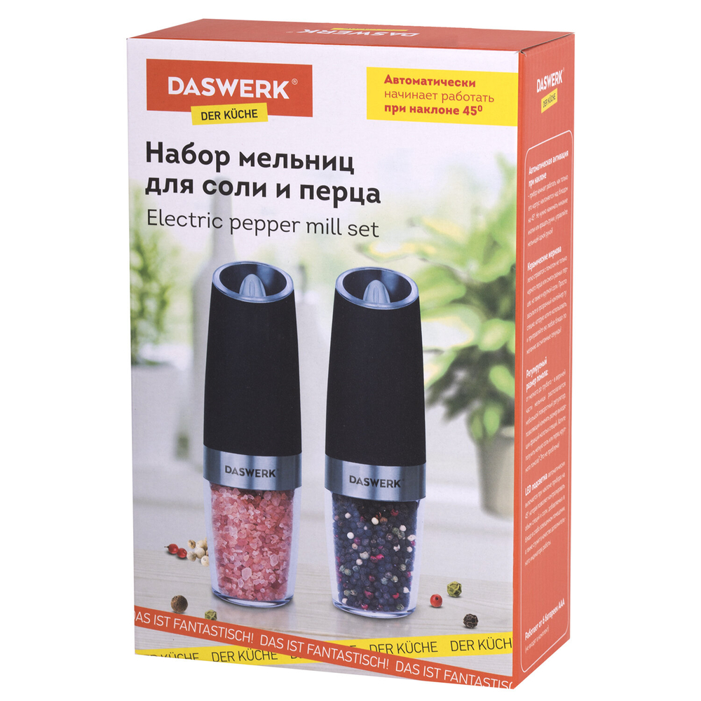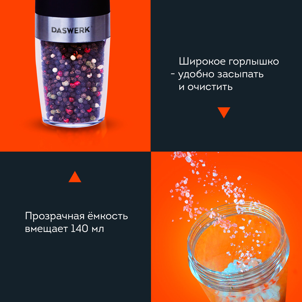 Гравитационные электрические мельницы Daswerk подходят для специй, морской соли, перца и различных трав. Эти устройства станут вашими незаменимыми помощниками на кухне.