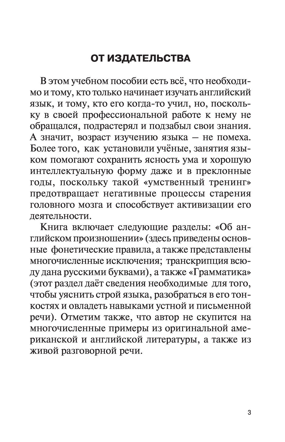 Убеждены в том, что начинать учить иностранный язык слишком поздно? Эта книга изменит ваше мнение и поможет вам сделать первые уверенные шаги в изучении английского языка. Издание включает в себя все самое необходимое: правила произношения, английскую грамматику, представленную в понятной и доступной форме, самые распространенные слова и выражения для ежедневного общения и многое другое. Выучить английский язык вовсе не сложно. Главное – начать!