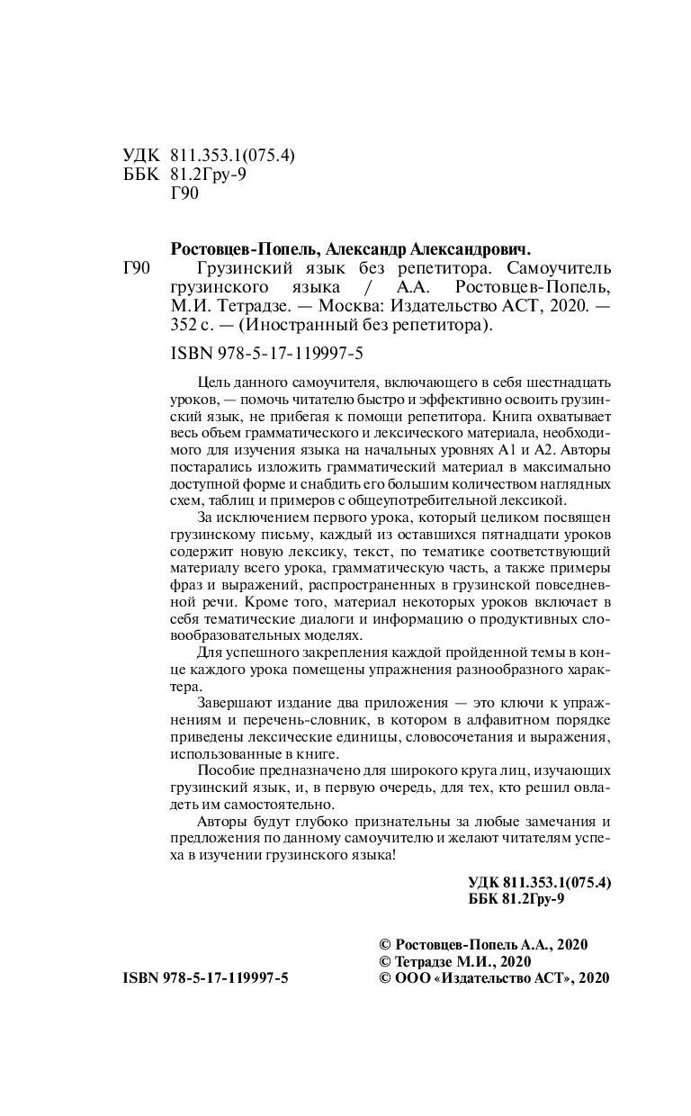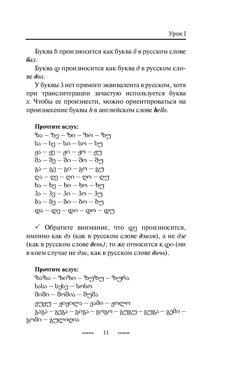 Цель данного самоучителя, включающего в себя шестнадцать уроков, – помочь читателю быстро и эффективно освоить грузинский язык, не прибегая к помощи репетитора. Книга охватывает весь объём грамматического и лексического материала, необходимого для изучения языка на начальных уровнях А1 и А2. Авторы постарались изложить грамматический материал в максимально доступной форме и снабдить его большим количеством наглядных схем, таблиц и примеров с общеупотребительной лексикой.