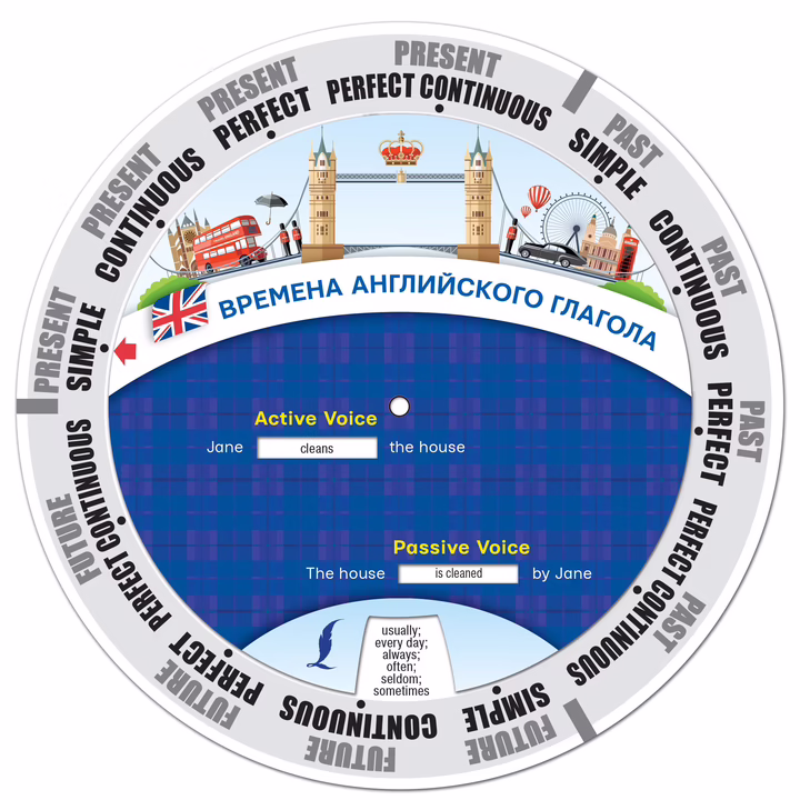 Диск-вертушка с временами английского глагола отлично подойдет всем тем, кто изучает английский язык. На подвижной части расположены окошки, позволяющие совместить нужные варианты употребления глагола в том или ином времени. Наглядная подача материала позволит легко и быстро выучить времена английского глагола.