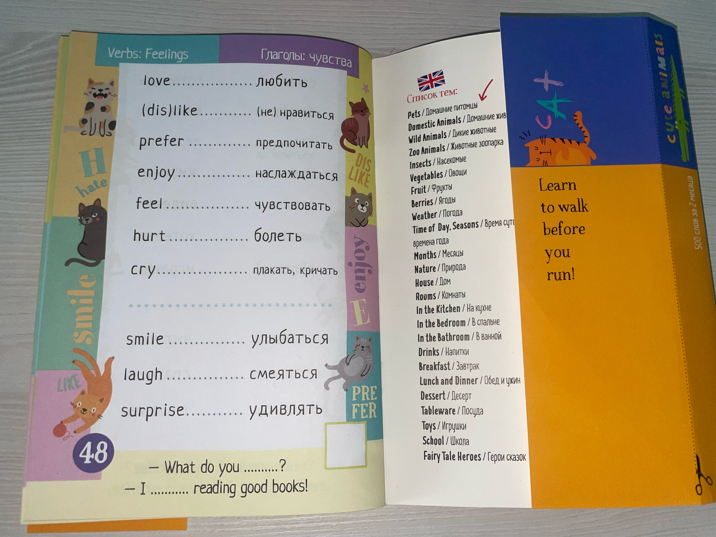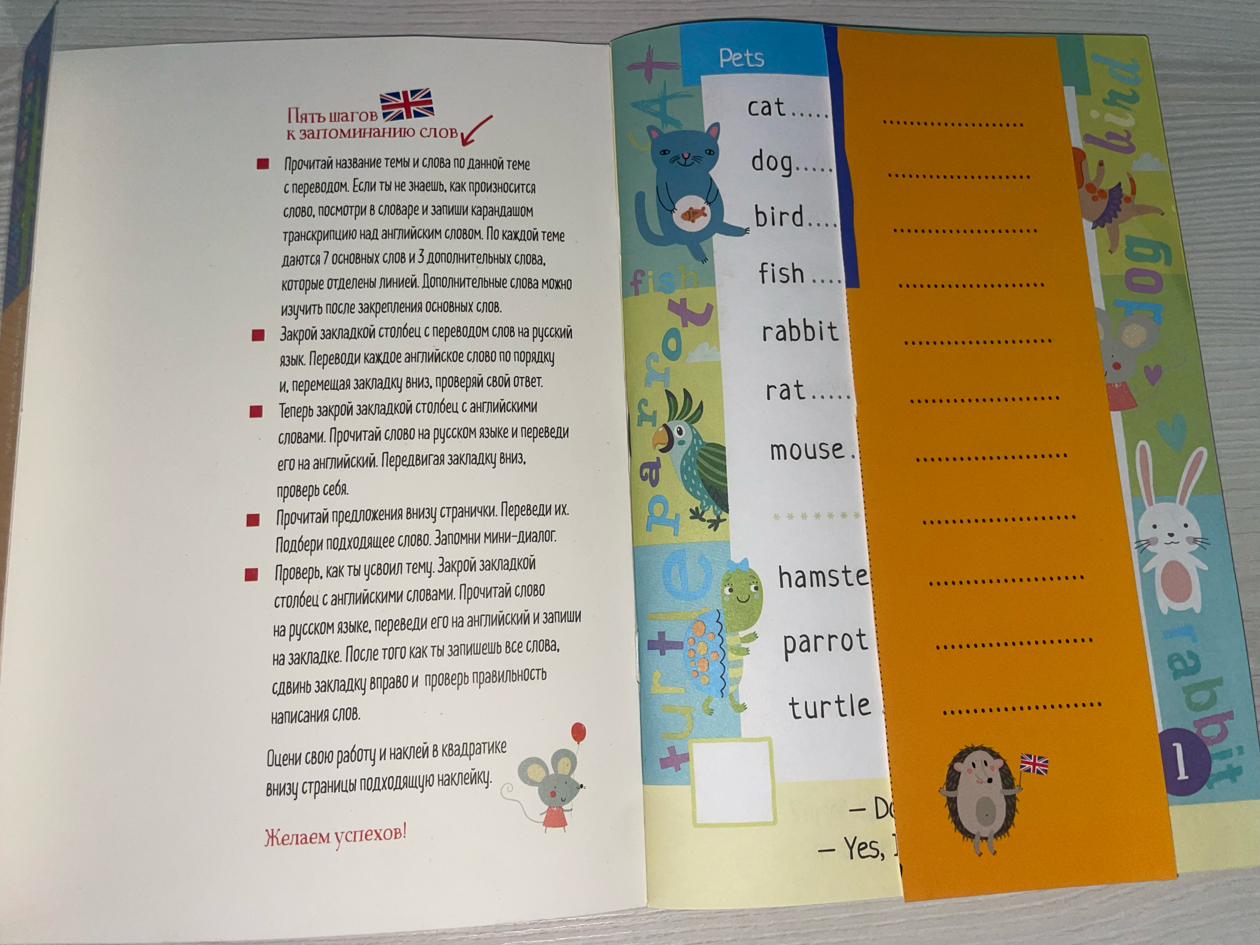 Рабочая тетрадь предназначена для активного запоминания английских слов. В данной тетради подобраны 500 слов, соответствующие уровню "Beginner". Для быстрого запоминания слова сгруппированы по темам. На каждой странице – новая тема и небольшой диалог. Один из клапанов обложки отрезается и используется как закладка. Закрывая закладкой поочерёдно слова на английском и русском языке, удобно прорабатывать лексику и проверять, насколько хорошо усвоена тема. Можно самостоятельно оценить свою работу и наклеить в квадратик внизу страницы подходящую наклейку. Лист с наклейками вложен в тетрадь.