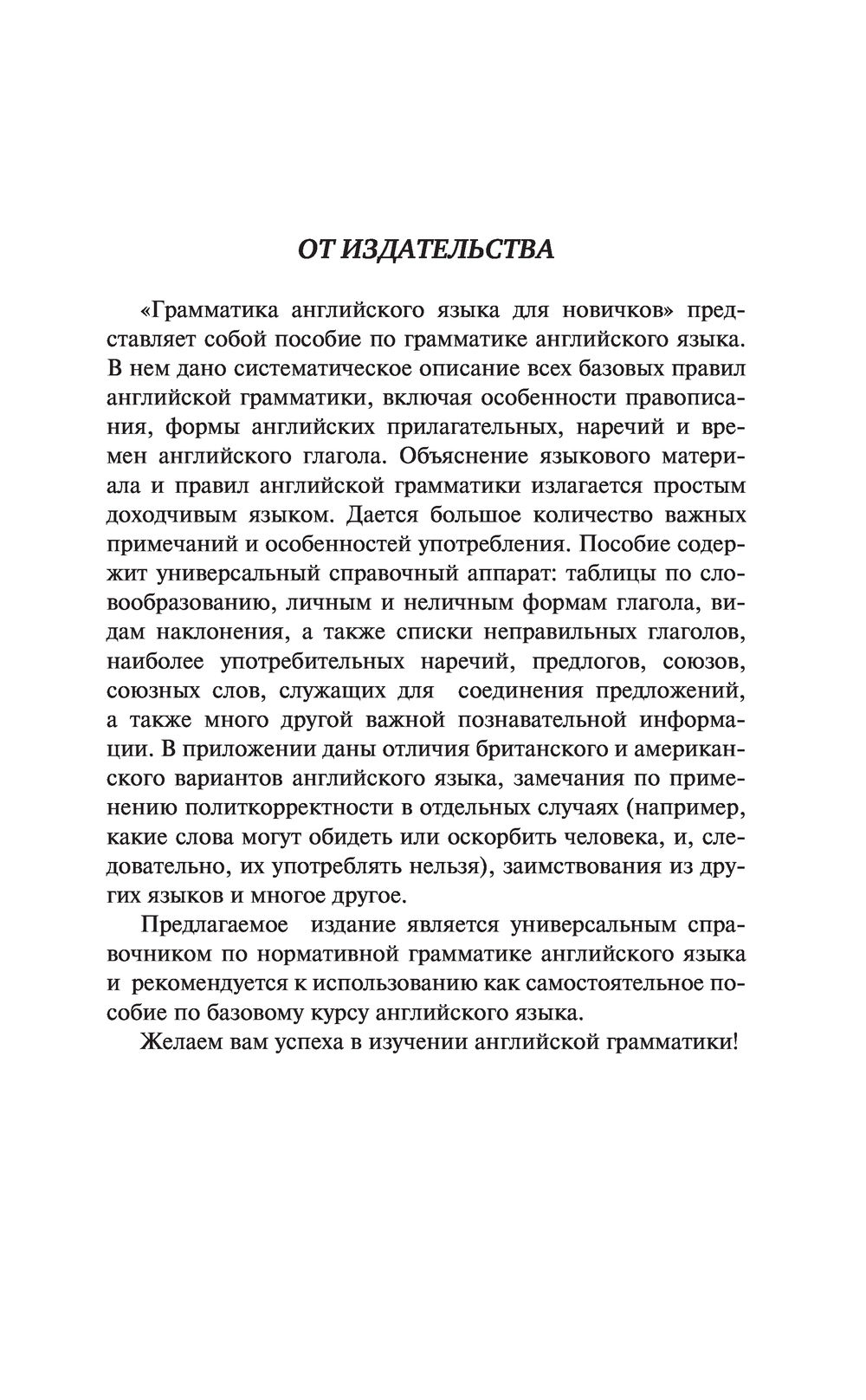 Сергей Александрович Матвеев – самый продаваемый автор в нише иностранных языков, полиглот, автор уникальной методики обучения языкам. Разберитесь в английских временах и узнайте разницу между few и a few с помощью пособия "Грамматика английского языка для новичков"! Благодаря системной подаче материала, понятным объяснениям, наглядным таблицам и большому количеству примеров вы легко привыкнете к логике другого языка. В пособии разбираются все части речи, особенности их изменения и употребления, приводятся правила использования различных грамматических конструкций. В конце книги сравниваются британский и американский варианты английского языка и показываются их различия на фонетическом, лексическом, грамматическом и синтаксическом уровнях. Пособие предназначено для всех, кто начинает учить английский язык.