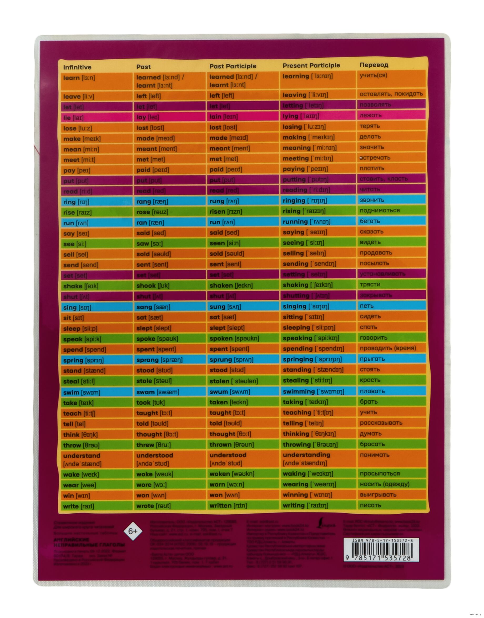 Плакат-подсказка "Английские неправильные глаголы" – незаменимый помощник в изучении английского языка. В таблице представлены 80 самых употребительных неправильных глаголов. К каждому глаголу даются три формы, а также ing-форма и перевод. Все формы глаголов снабжены международной фонетической транскрипцией. Глаголы с похожим способом образования форм выделены одинаковыми цветами.