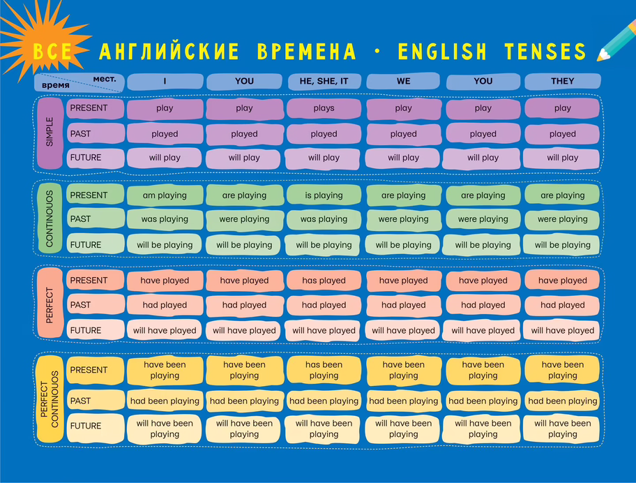 Плакат "Все английские времена" – незаменимый помощник в изучении английского языка. Плакат-подсказка демонстрирует изменение глагола по временам, а также построение вопросительных и отрицательных предложений в разных временах.