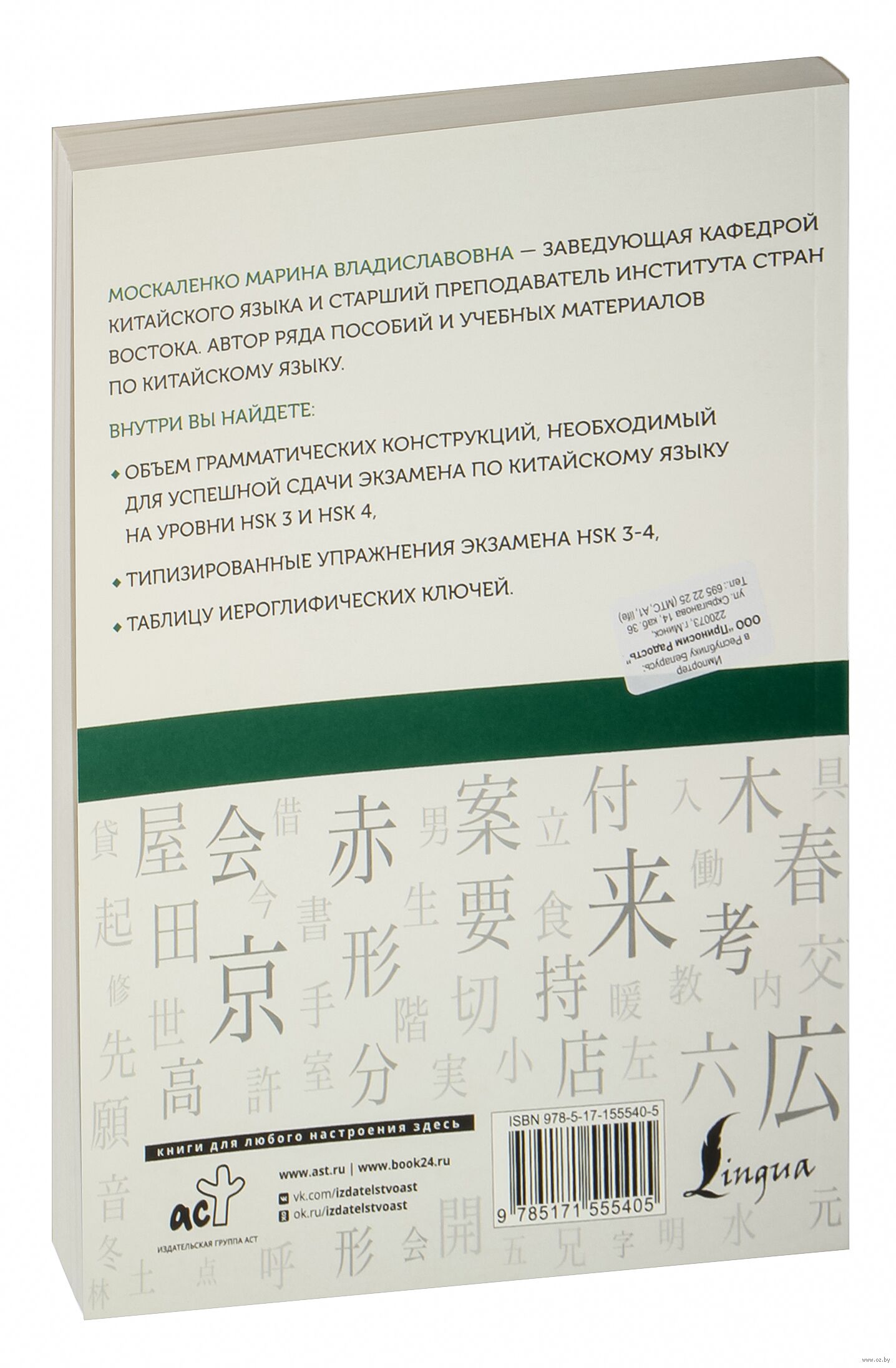 Данное пособие рассчитано на подготовку к письменной части международного экзамена по китайскому языку HSK. Здесь вы найдете объем лексики и грамматических конструкций, необходимый для успешной сдачи экзамена на уровни HSK 3 и HSK 4, а также типизированные упражнения экзамена HSK.