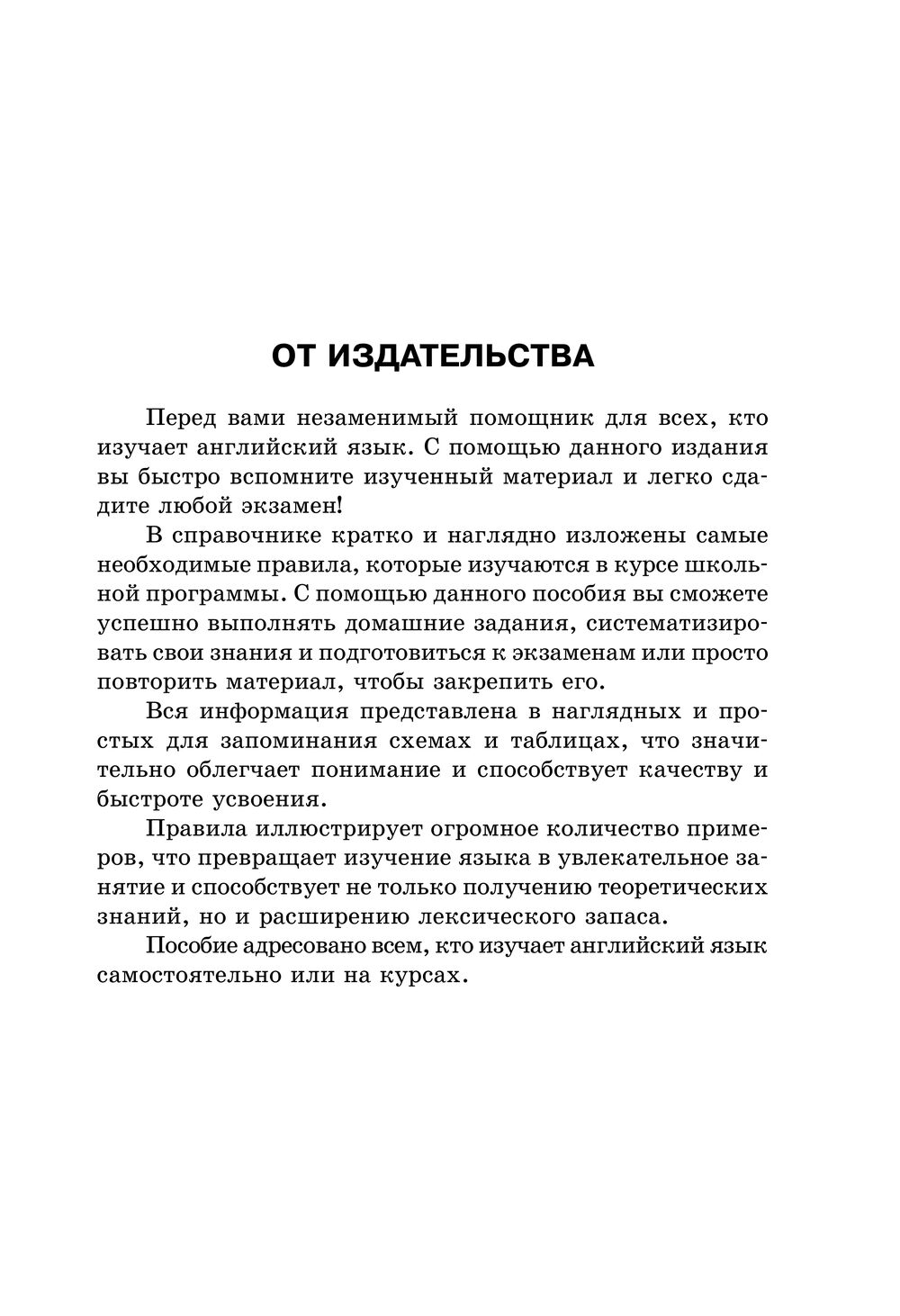Данный справочник содержит базовый курс английской грамматики. Все правила проиллюстрированы примерами с переводом на русский язык. Простые таблицы и схемы помогут в кратчайшие сроки освоить или повторить любую грамматическую тему.