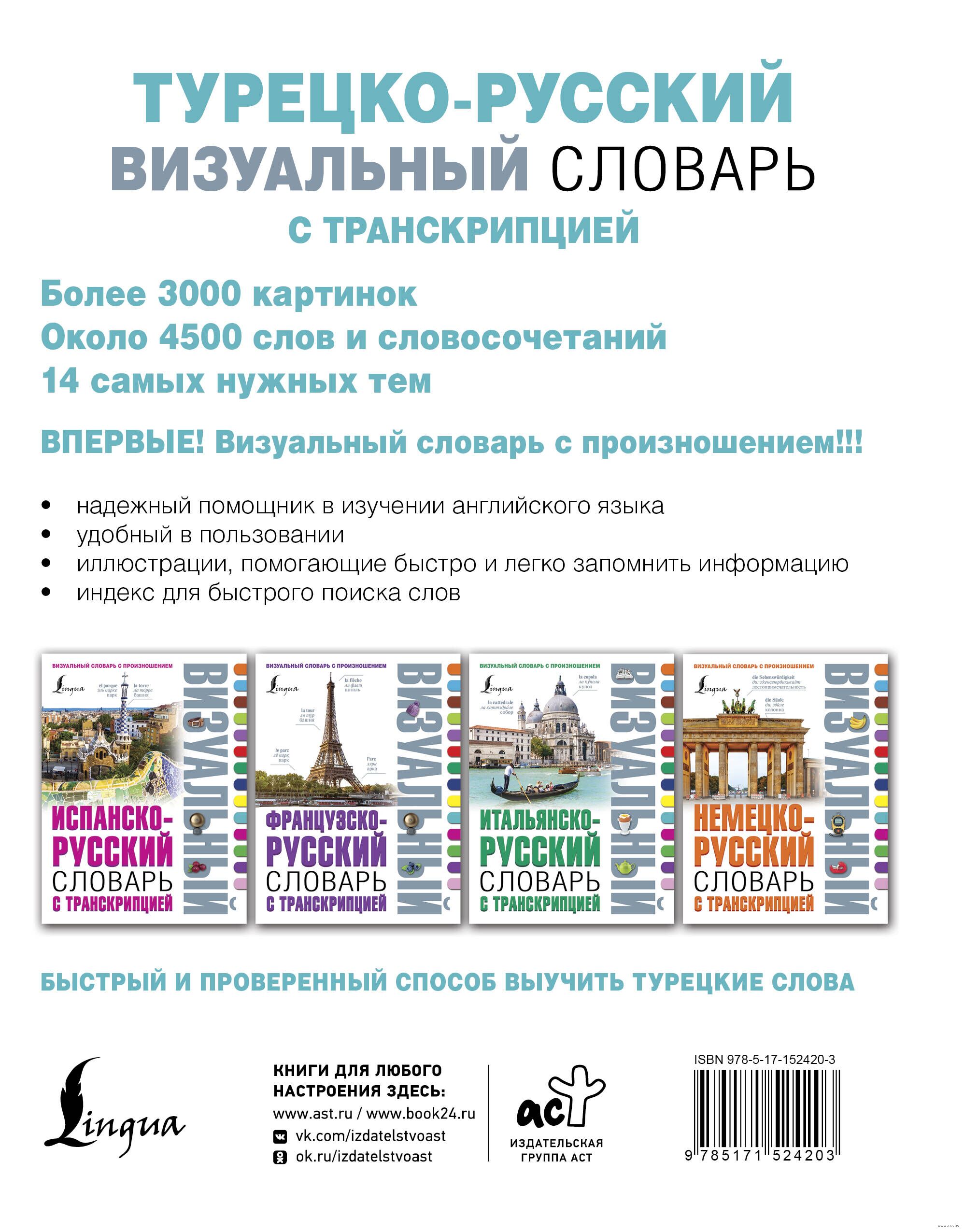 Турецко-русский визуальный словарь содержит около 4500 слов и словосочетаний и более 3000 картинок, помогающих быстро и легко запомнить информацию.