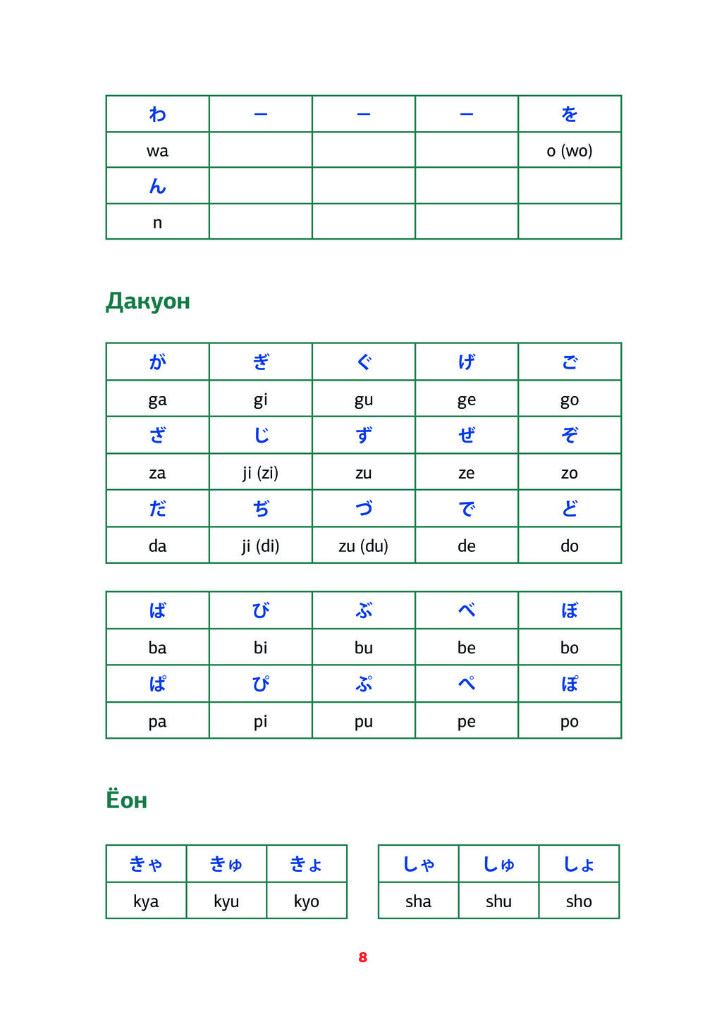 Данное пособие познакомит вас с основными сведениями о системе японского письма и правилами употребления азбук хирагана и катакана. Здесь вы найдете информацию о японских буквосочетаниях и звуках с подробным объяснением их произнесения, а также упражнения для тренировки, которые помогут закрепить материал и поставить правильное произношение. Вы сможете читать и произносить слова, не задумываясь над правилами!