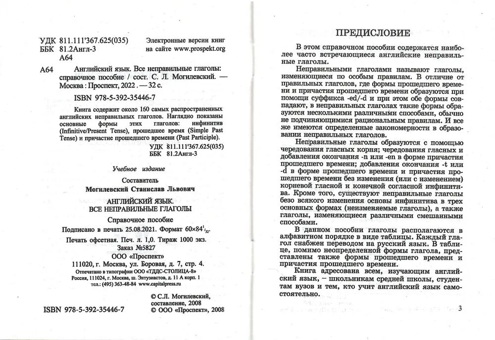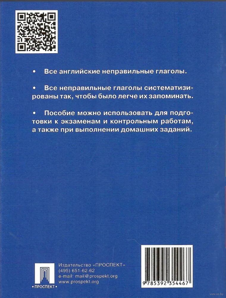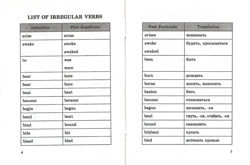Книга содержит около 160 самых распространённых английских неправильных глаголов. Наглядно показаны основные формы этих глаголов: инфинитив (Infinitive/Present Tense), прошедшее время (Simple Past Tense) и причастие прошедшего времени (Past Participle).