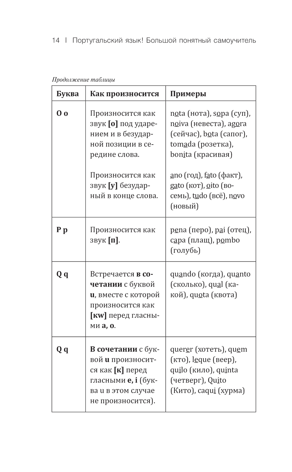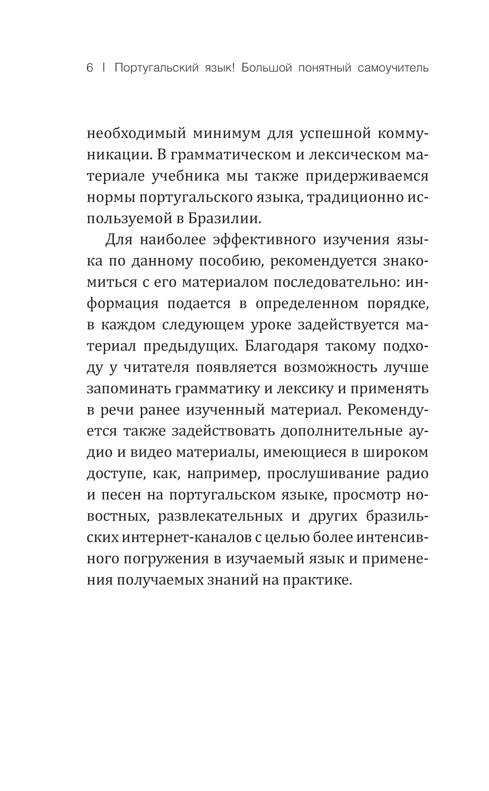Этот самоучитель поможет читателям овладеть основами бразильского варианта португальского языка самостоятельно. В книге вы найдете правила чтения и произношения, важные грамматические темы, а также тексты для чтения. Материал в пособии изложен простым и понятным языком, легко запоминается благодаря большому количеству наглядных таблиц и примеров с общеупотребительной лексикой. Для успешного закрепления каждого урока даны упражнения, ключи к которым помещены в конце книги.