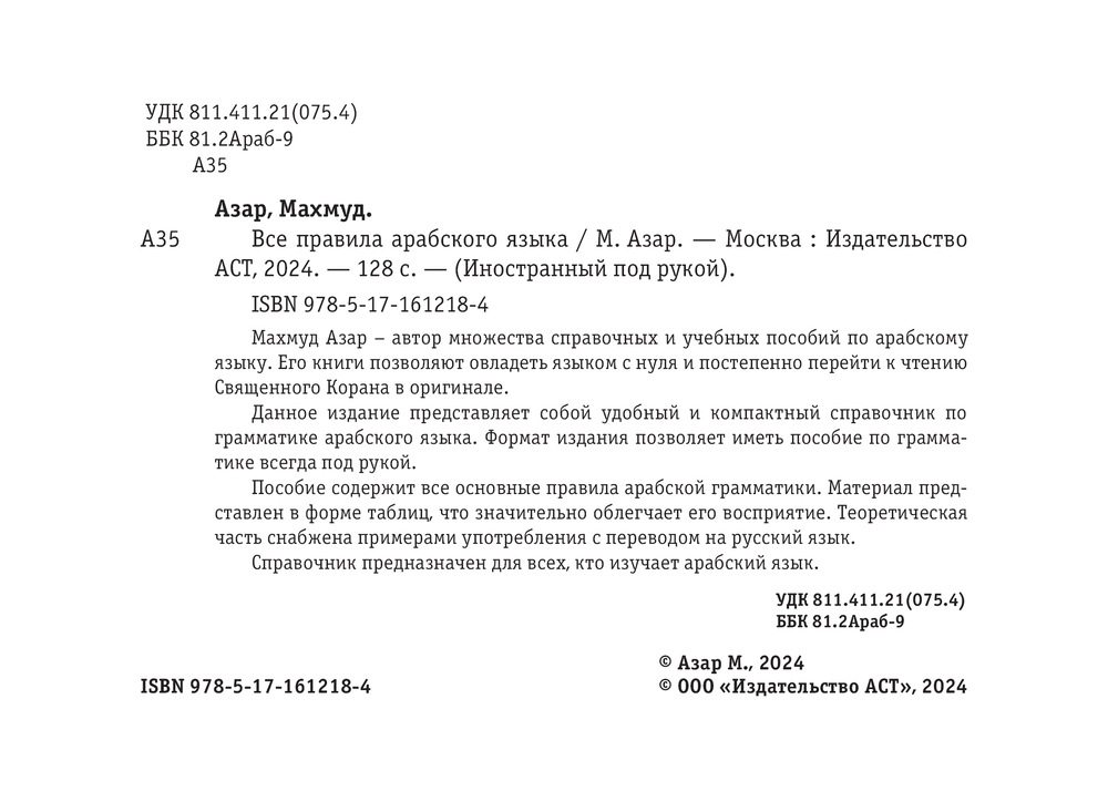 Данное издание представляет собой удобный и компактный справочник по грамматике арабского языка. Формат издания позволяет иметь пособие по грамматике всегда под рукой.