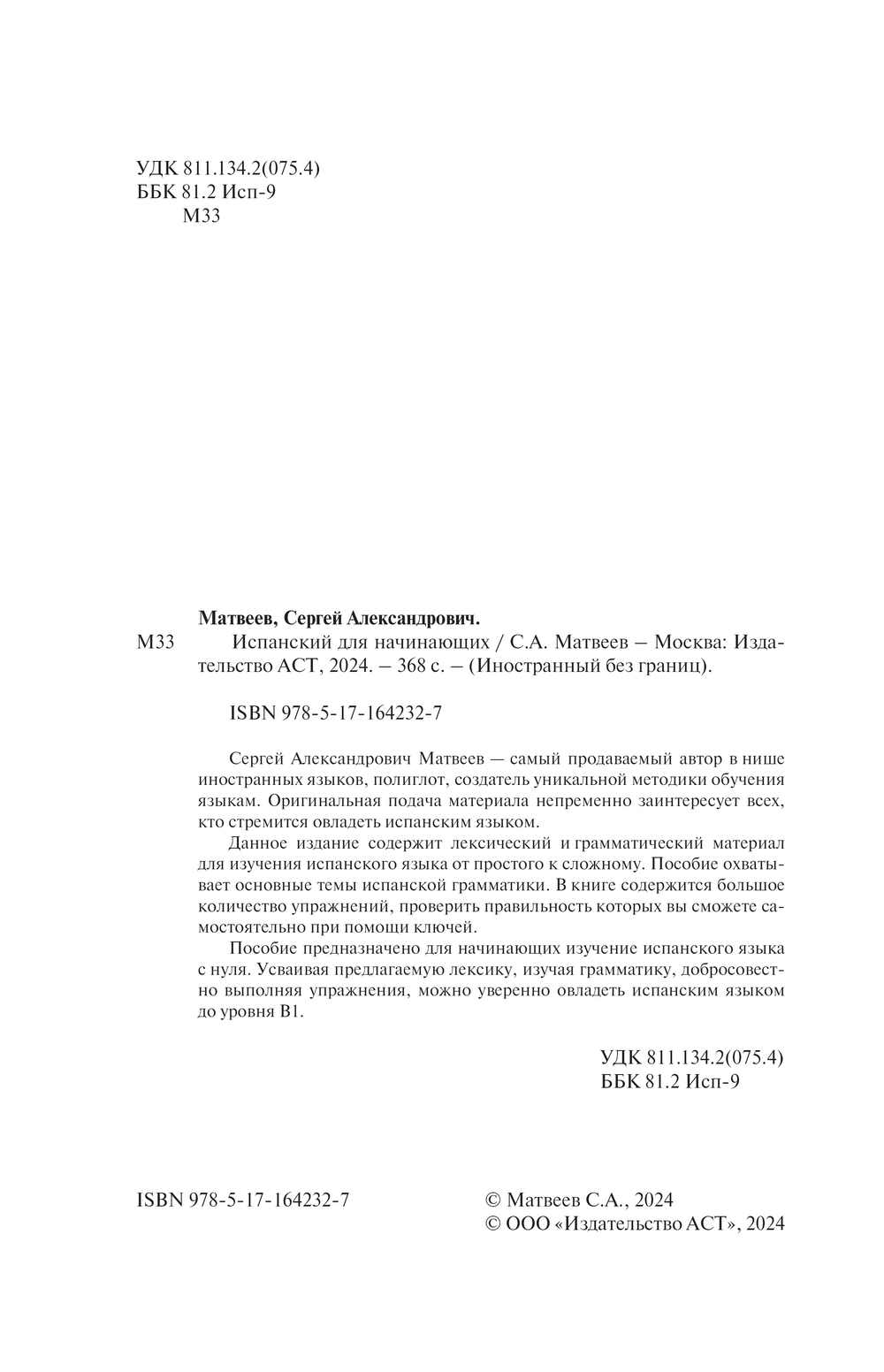 Сергей Александрович Матвеев – самый продаваемый автор в нише иностранных языков, полиглот, создатель уникальной методики обучения языкам. Оригинальная подача материала непременно заинтересует всех, кто стремится овладеть испанским языком.
