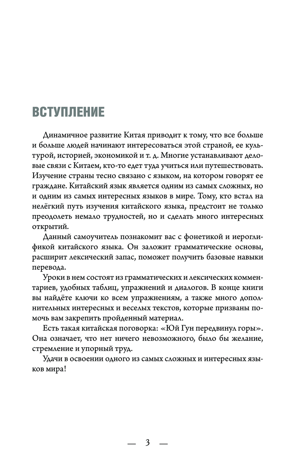 Данное пособие содержит лексический и грамматический материал для изучения китайского языка с нулевого уровня. В отработке языковых навыков и речевых умений вам помогут упражнения, ключи к которым расположены в конце книги. Пособие также научит вас работать с текстами на китайском языке и сообщит интересные сведения о культуре современного Китая. Курс соответствует уровням 1 и 2 HSK.