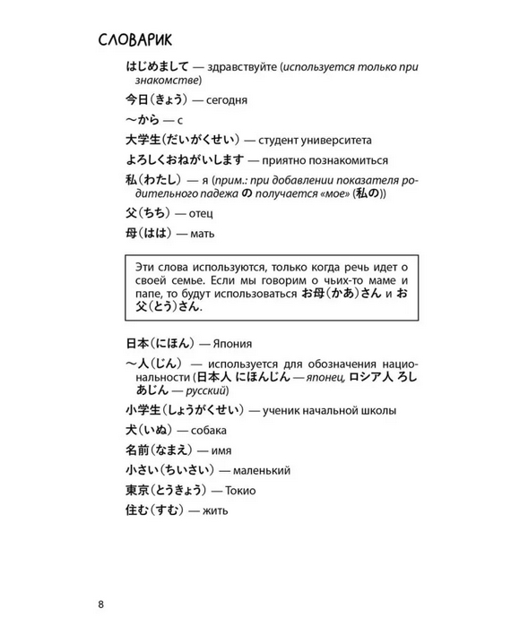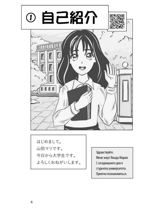 Каждый учебный текст – небольшой рассказ, не только озвученный носителем языка (все аудио можно найти по QR-кодам, представленным в книге), но и проиллюстрированный в стиле манга. После каждого рассказа дан перевод на самопроверку, а также словарик, теоретический комментарий и упражнения на повторение изученного материала.
