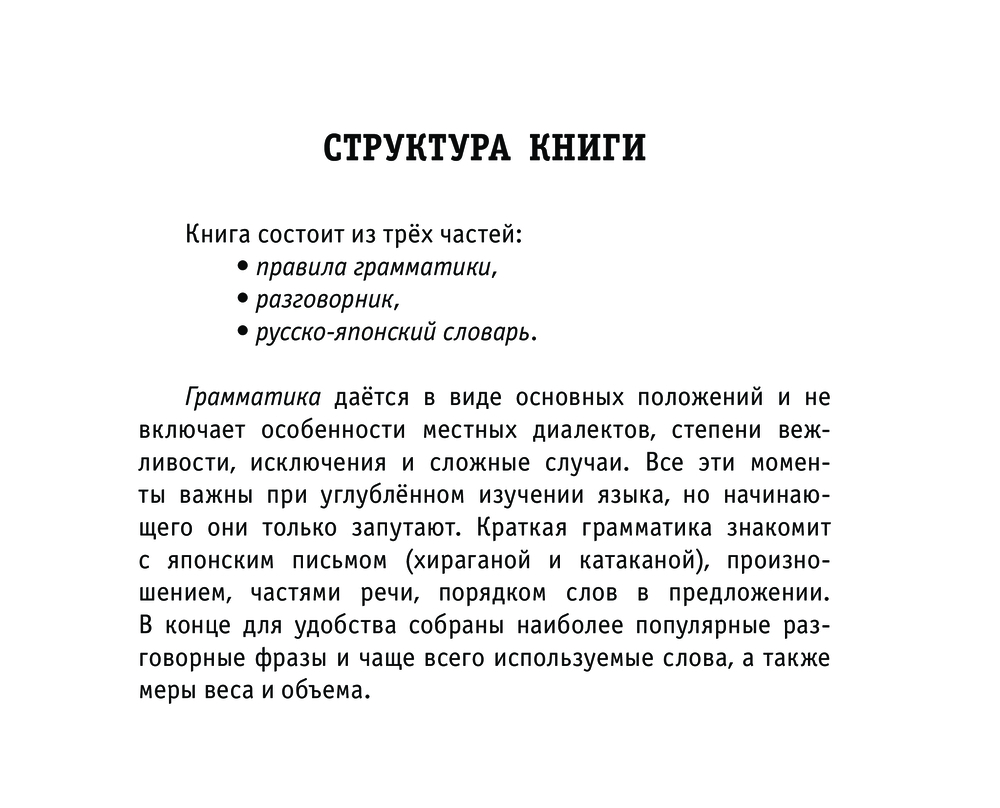 В Краткой грамматике даются базовые сведения об особенностях японского письма, произношения и частям речи. Во второй части содержатся самые необходимые слова и фразы для свободного общения. Русско-японский словарь поможет расширить словарный запас.