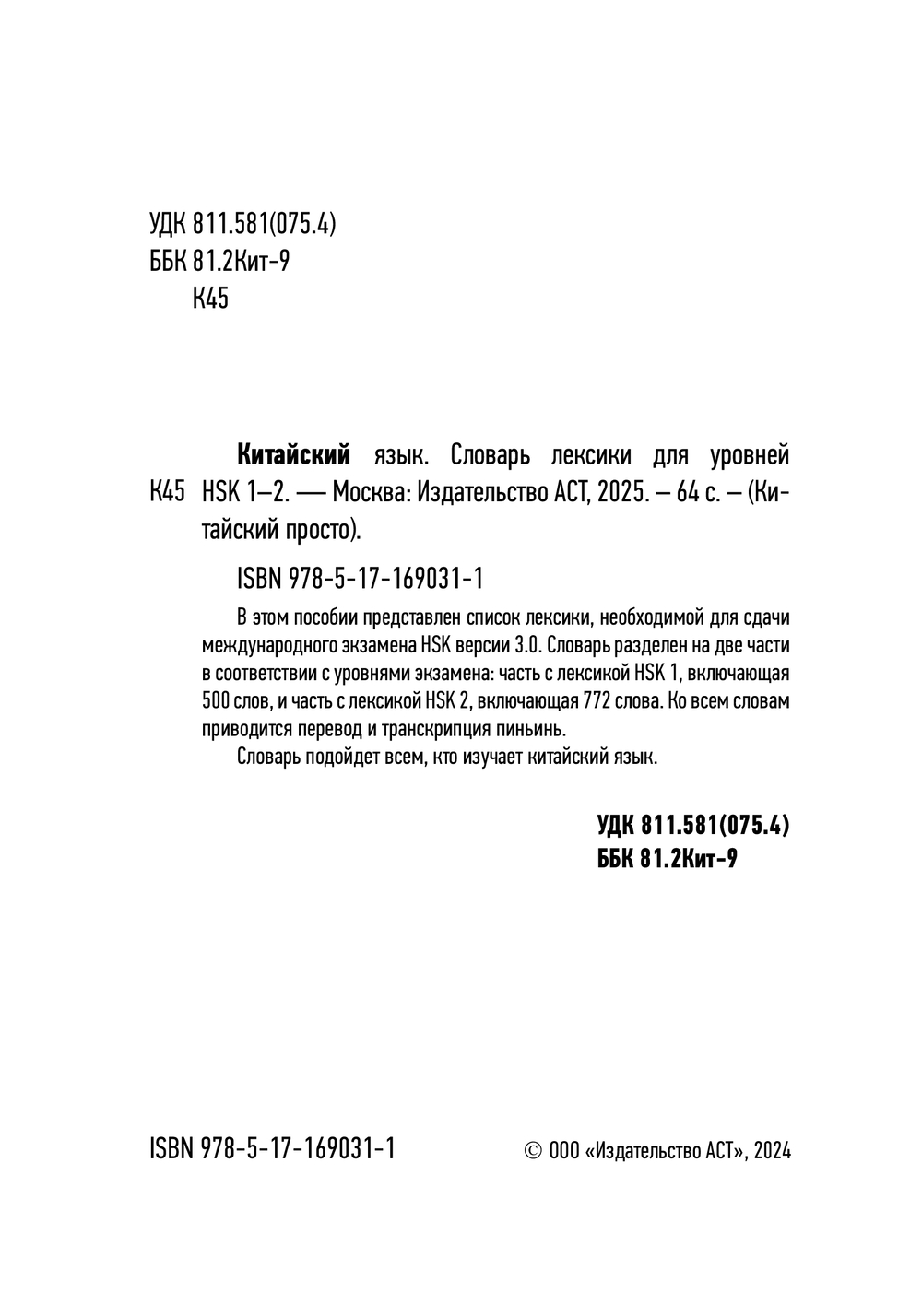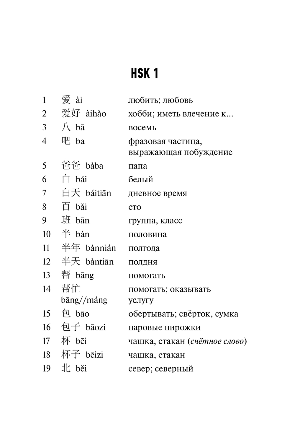 В этом пособии представлен список лексики, необходимой для сдачи международного экзамена HSK версии 3.0. Словарь разделен на две части в соответствии с уровнями экзамена: часть с лексикой HSK 1, включающая 500 слов, и часть с лексикой HSK 2, включающая 772 слова. Ко всем словам приводится перевод и транскрипция пиньинь.