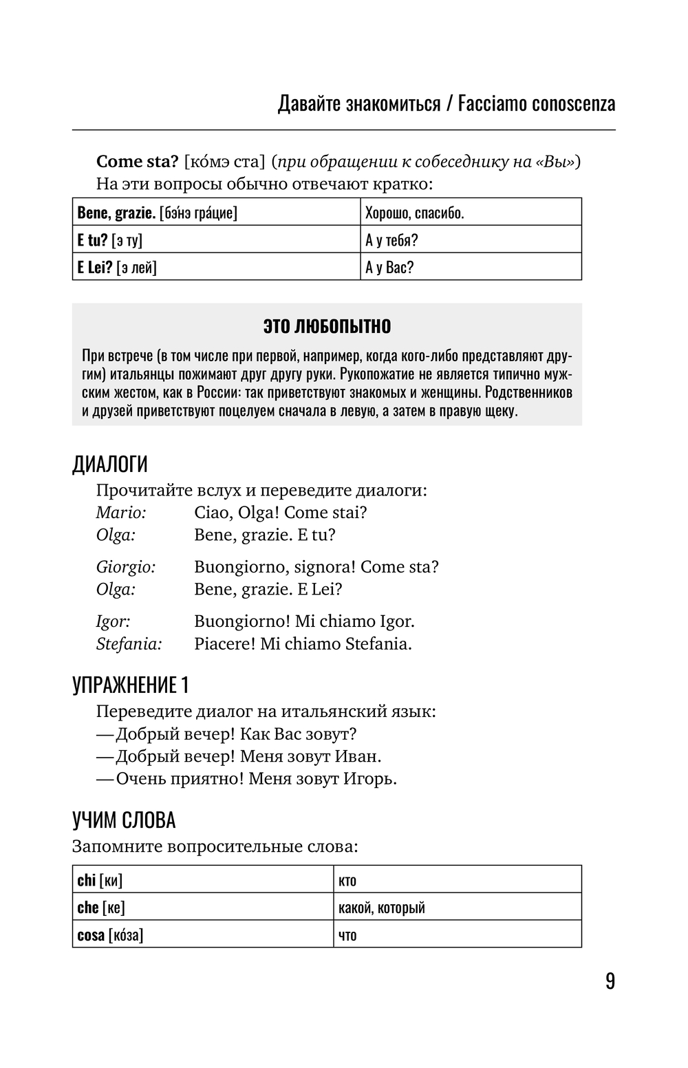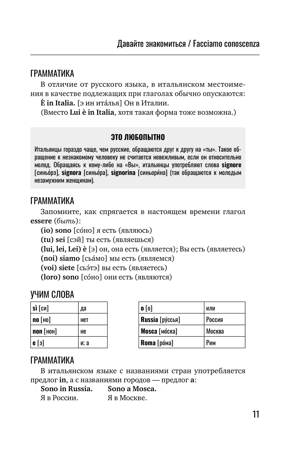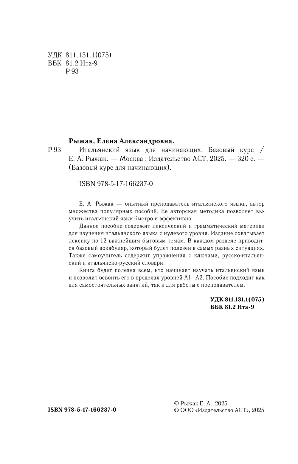 Книга будет полезна всем, кто начинает изучать итальянский язык и позволит освоить его в пределах уровней A1-A2. Пособие подходит как для самостоятельных занятий, так и для работы с преподавателем.