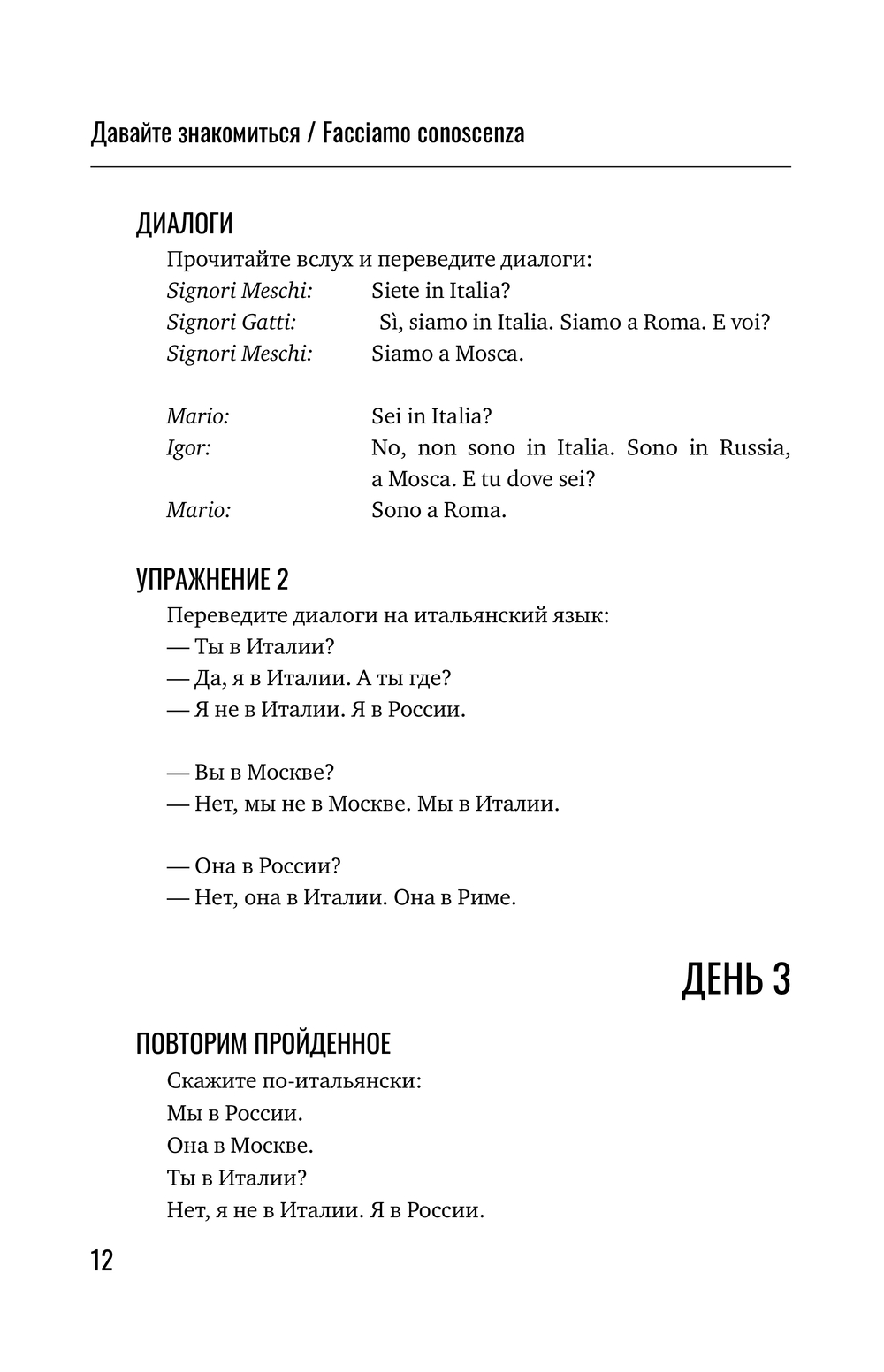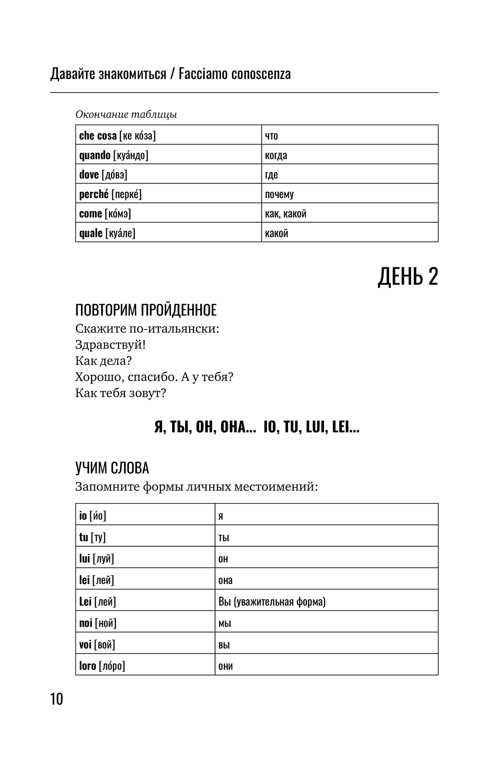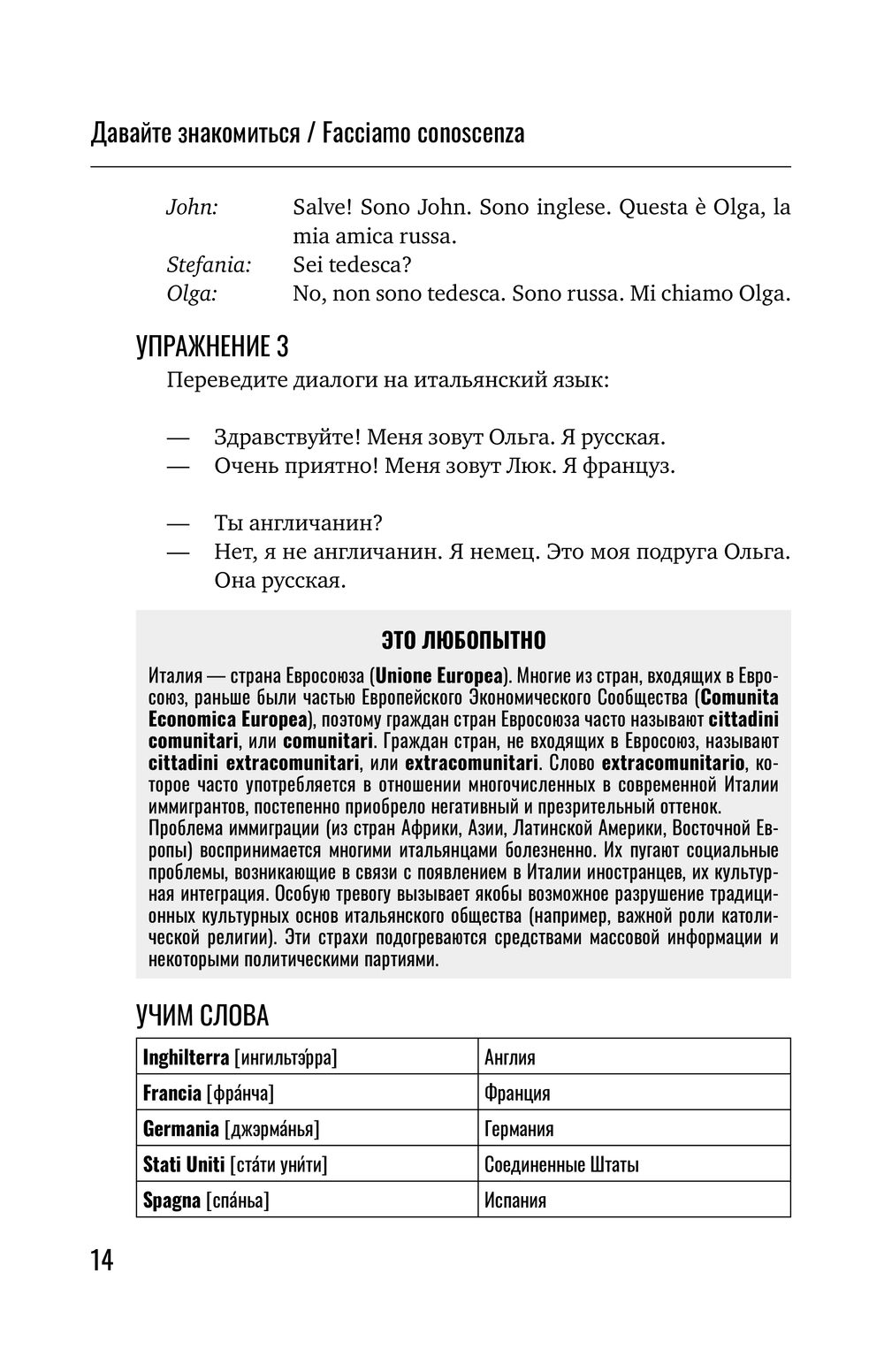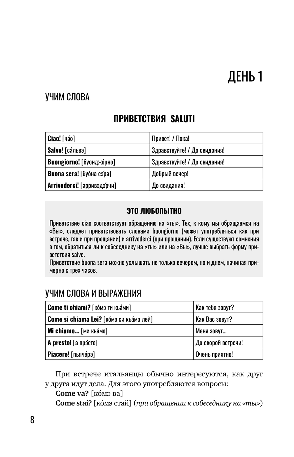 Книга будет полезна всем, кто начинает изучать итальянский язык и позволит освоить его в пределах уровней A1-A2. Пособие подходит как для самостоятельных занятий, так и для работы с преподавателем.