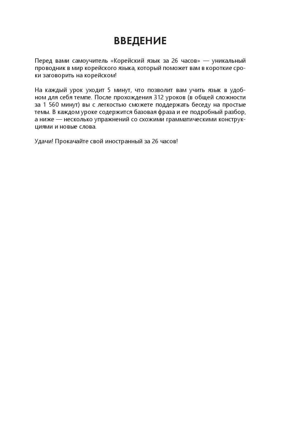 "Корейский язык за 26 часов" – это практический самоучитель, который поможет вам быстро и без усилий овладеть необходимыми грамматическими конструкциями и заговорить на корейском. В каждом уроке дается одно базовое выражение и несколько новых слов. После прохождения 312 уроков по 5 минут вы сможете легко поддержать беседу на простые темы.