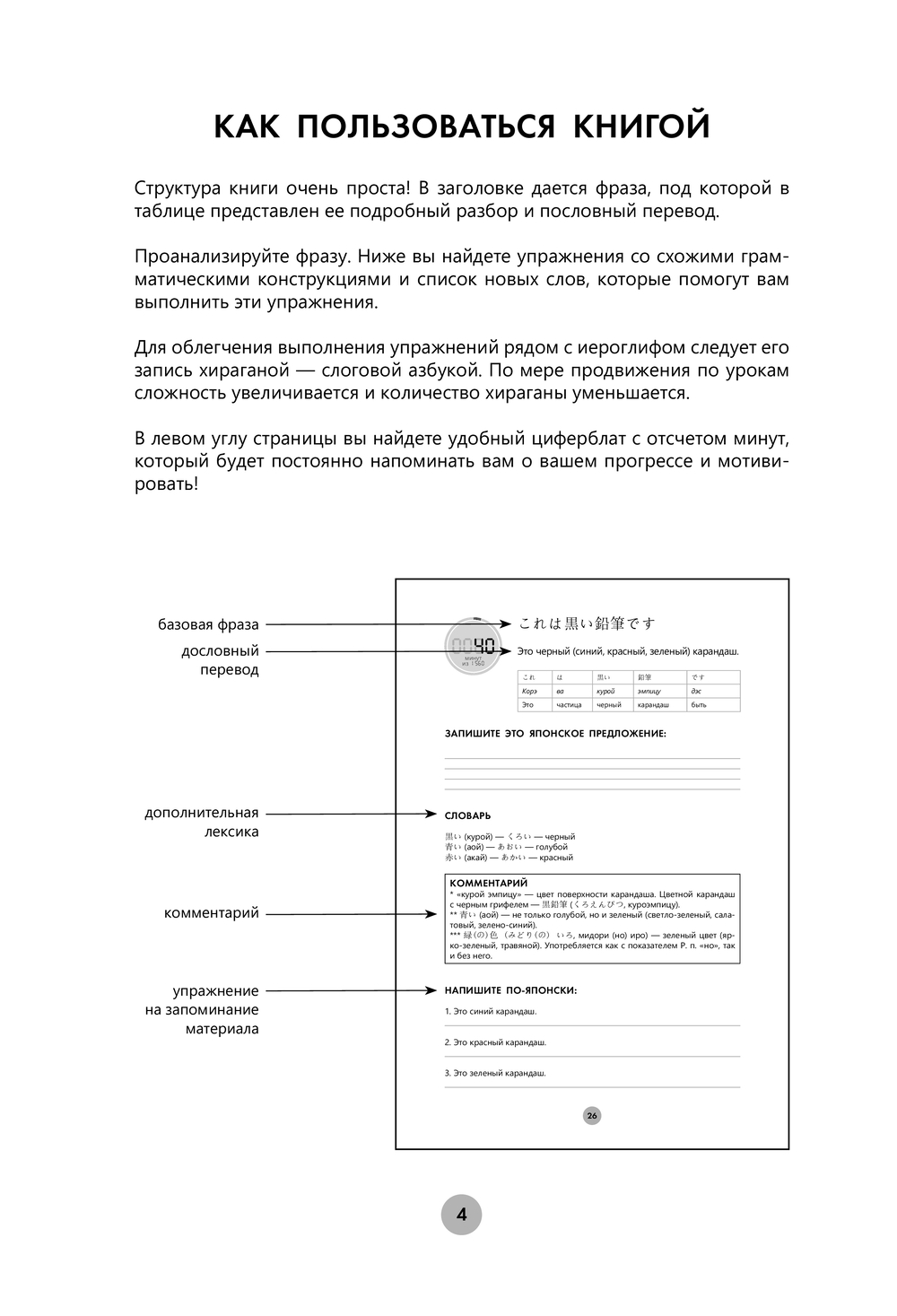 В каждом уроке содержится базовая фраза и ее подробный разбор, а ниже – несколько упражнений со схожими грамматическими конструкциями и новые слова.