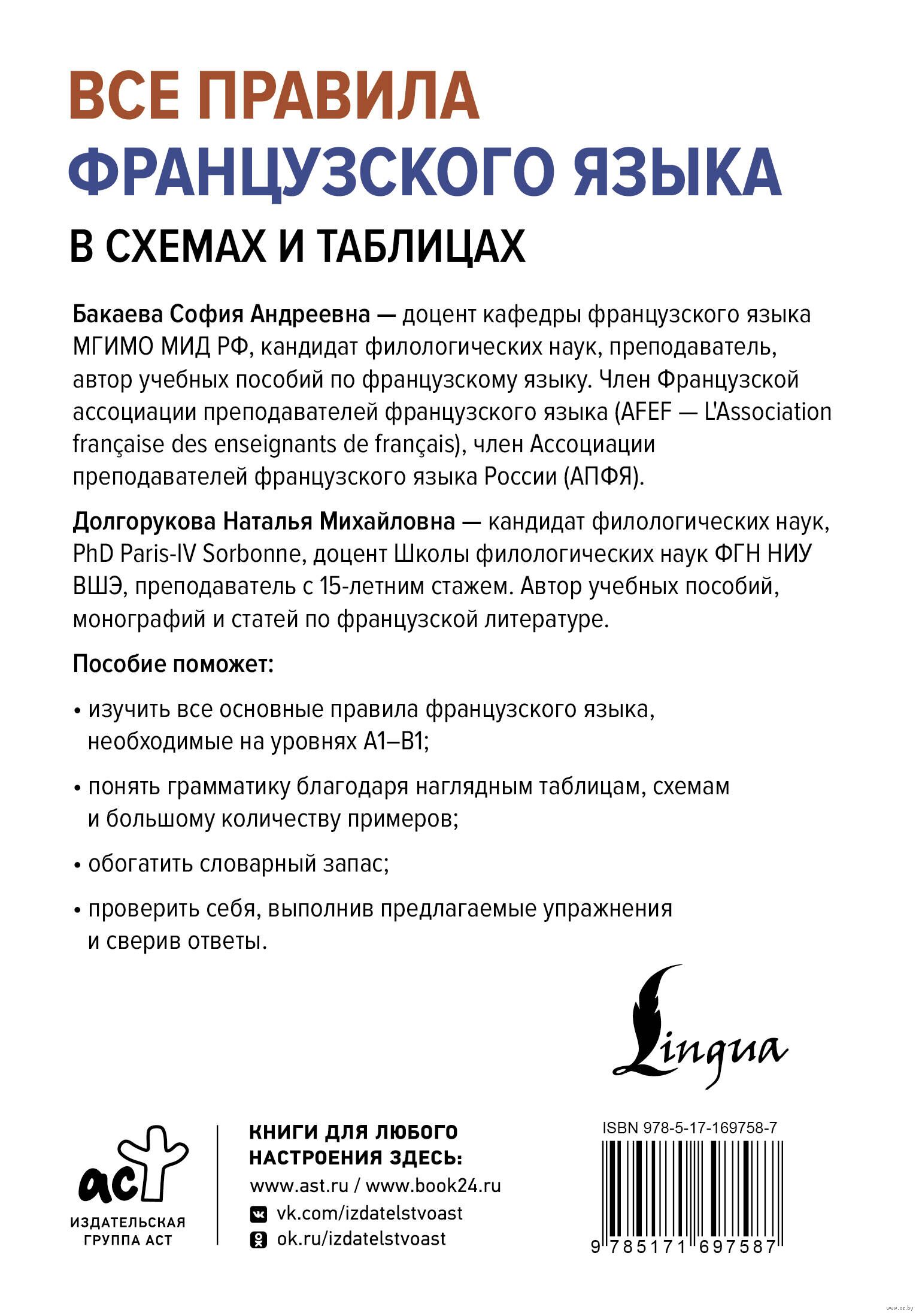 Бакаева София Андреевна – доцент кафедры французского языка МГИМО МИД РФ, кандидат филологических наук, преподаватель, автор учебных пособий по французскому языку. Член Французской ассоциации преподавателей французского языка (AFEF – L'Association française des enseignants de français), член Ассоциации преподавателей французского языка России (АПФЯ). Долгорукова Наталья Михайловна – кандидат филологических наук, PhD Paris-IV Sorbonne, доцент Школы филологических наук ФГН НИУ ВШЭ, преподаватель с 15-летним стажем. Автор учебных пособий, монографий и статей по французской литературе. Авторы написали пособие, с помощью которого вы изучите все основные правила французского языка, необходимые на уровнях A1-B1; поймете грамматику благодаря наглядным таблицам, схемам и большому количеству примеров; обогатите словарный запас; сможете проверить себя, выполнив предлагаемые упражнения и сверив ответы.