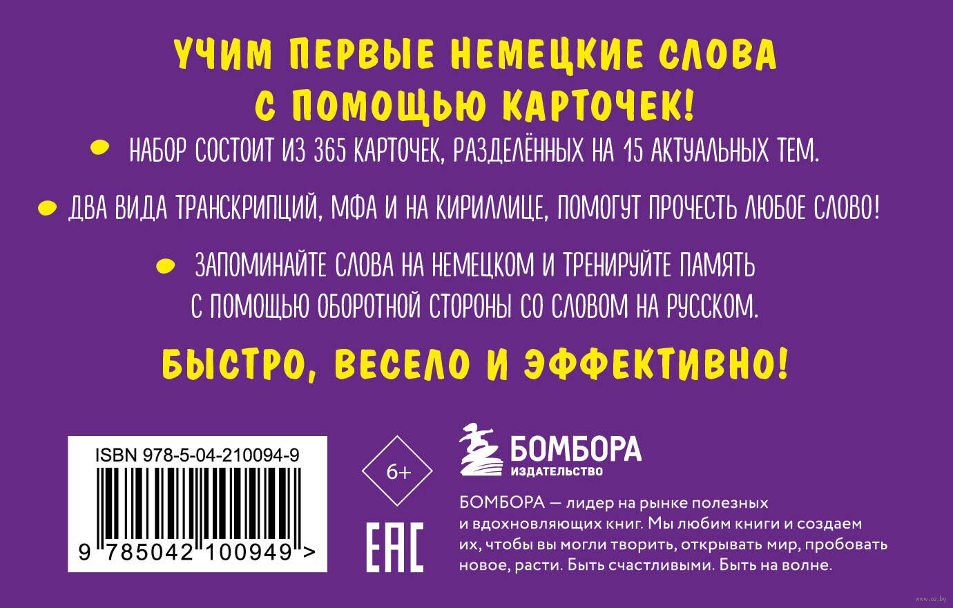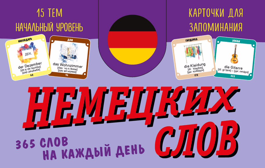 Набор для запоминания немецких слов состоит из 365 карточек, разделенных на 15 актуальных тем. Каждая тема выделена своим цветом, а слова сопровождаются красочными иллюстрациями. Карточки двухсторонние: со словом на русском и немецком. Благодаря двум видам транскрипций, МФА и на кириллице, вы без труда запомните правильное произношение каждого слова.